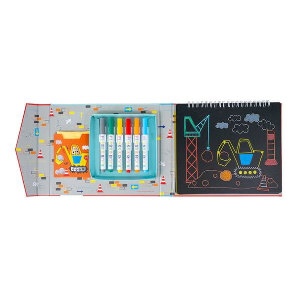 Zabawa szkicownikiem z kredowymi pisakami, idealna dla małych artystów! To genialny szkicownik z kartami, które można pokolorować pisakami na bazie kredy. Szkicownik zawiera 5 kart z gotowymi ilustracjami do pokolorowania i 3 puste karty, na których można tworzyć własne wzory i obrazki. Znajduje się tam również arkusz kalki kreślarskiej oraz arkusz szablonów z koparką, dźwigiem, betoniarką i innymi. Oba te arkusze można przypiąć do spirali szkicownika. W zestawie znajduje się 6 kolorowych pisaków kredowych oraz ściereczka do czyszczenia, dzięki której można zetrzeć karty i rozpocząć kreatywną zabawę od początku.