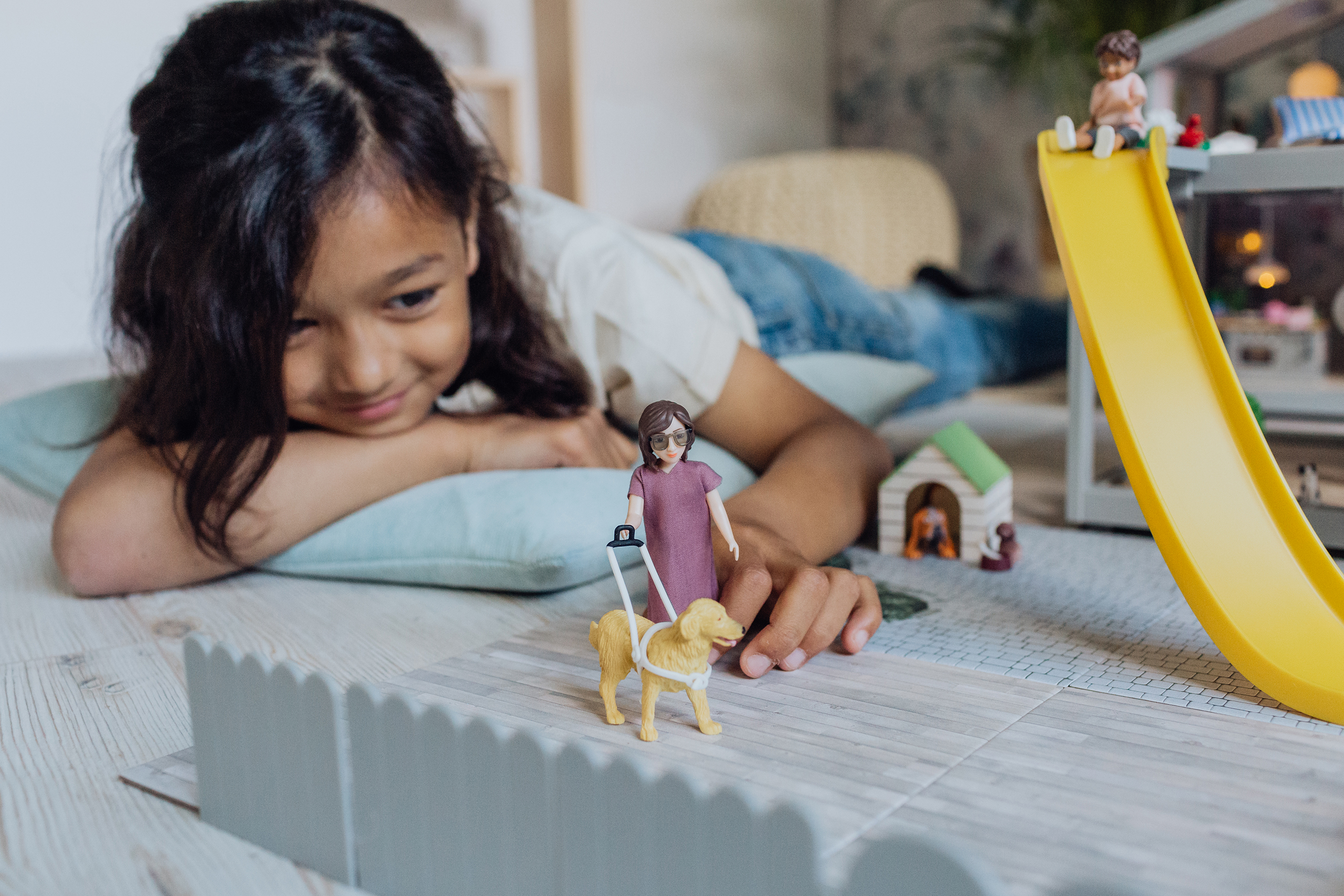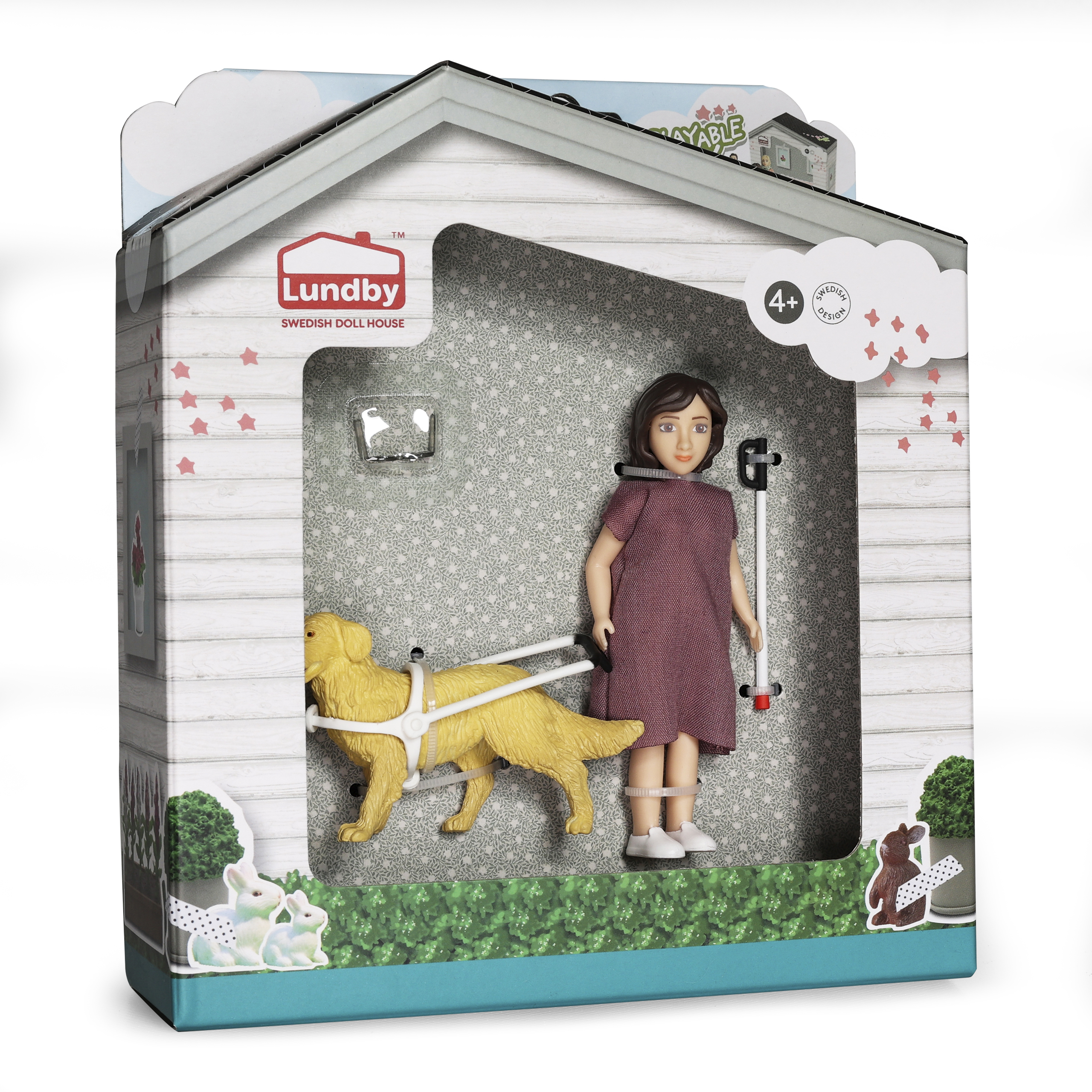 Niewidoma lalka z psem przewodnikiem zestaw, zabawka domek dla lalek Lundby