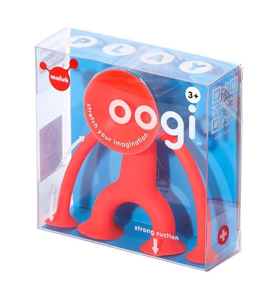 Czerwony, rozciągliwy ludzik Oogi Junior (8 cm) od Moluk to całkiem nowy rodzaj zabawki. Aż prosi się, by wziąć go do ręki i zaprosić do zabawy. Dzięki przyssawkom na głowie, rękach i nogach można z łatwością przymocować go do każdej gładkiej powierzchni.