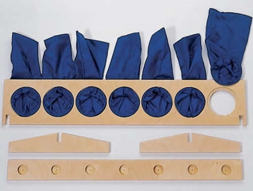 Drewniany panel w lnianymi woreczkami, do których wkłada się 7 różnych kulek. Drugie 7 kulek ustawia się na panelu. Należy odszukać kulki do pary.