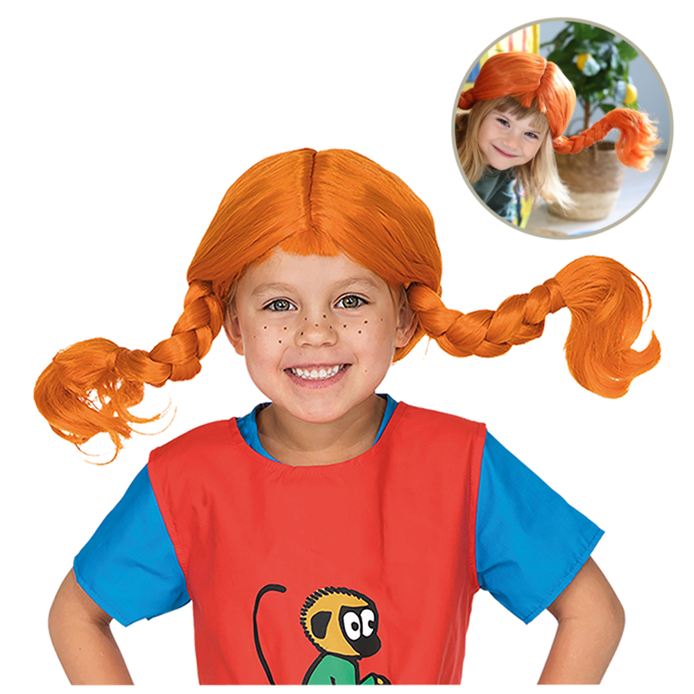Oto peruka Pippi ze wspaniale odwzorowanymi wywijającymi się rudymi warkoczami. Doskonale się sprawdza w połączeniu z kostiumem i butami Pippi sprzedawanymi osobno, podczas balu przebierańców, balu karnawałowego lub zawsze wtedy gdy Twoje dziecko będzie miało ochotę przemienić się w małą słynną superbohaterkę.
