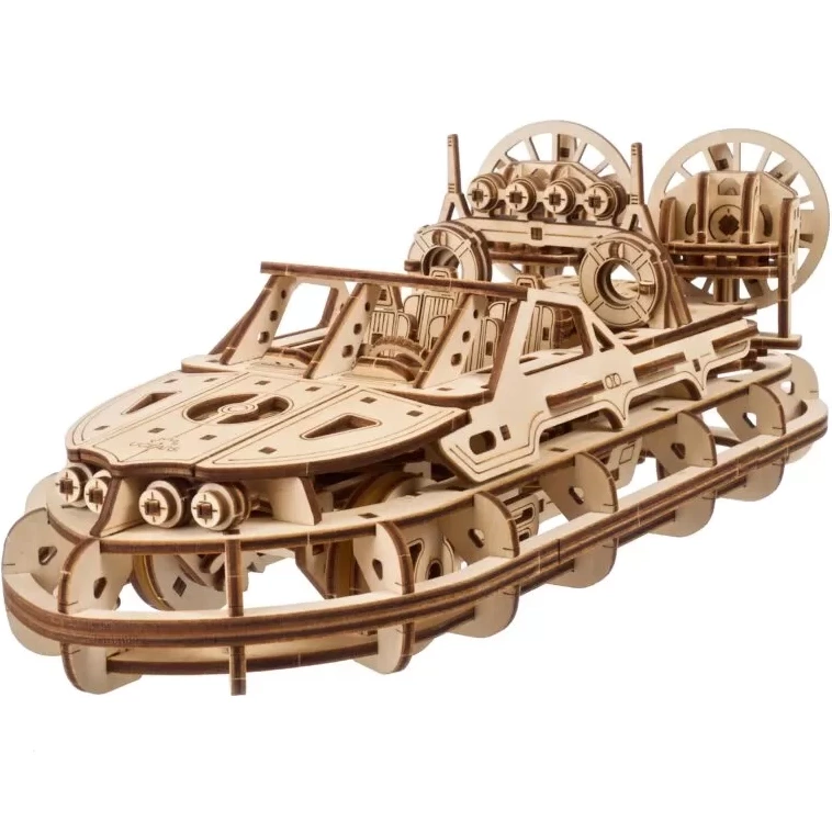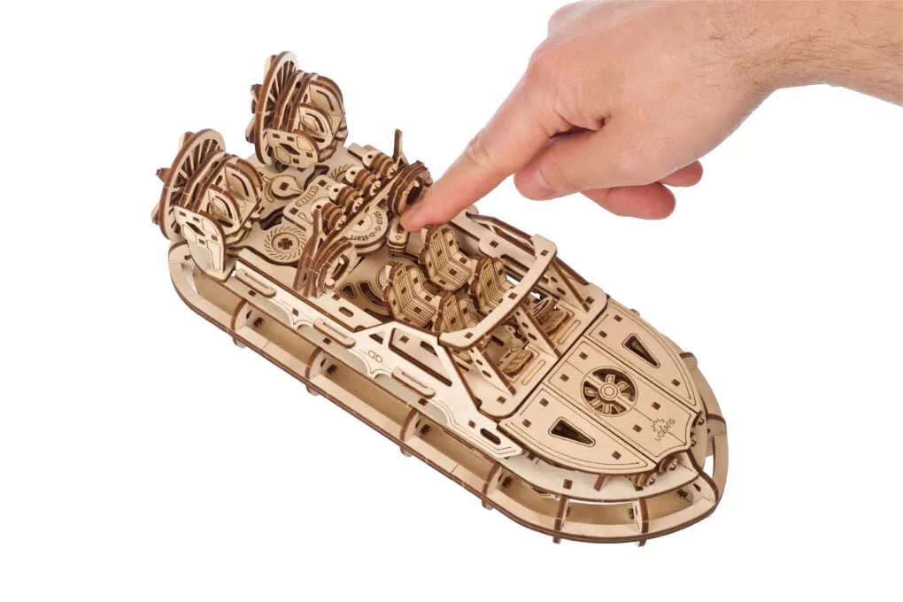 Poduszkowiec ratunkowy od UGEARS to model z drewna eleganckiego, dwuśmigłowego poduszkowca przeznaczonego do jazdy w każdym terenie w skali 1:24. Ten model z drewna do samodzielnego montażu jest napędzany silnikiem sprężynowym, z kluczem do nakręcania znajdującym się na spodzie pojazdu. Przełącznik Start/Stop pozwala nakręcić silnik, dokonując dziesięciu obrotów zgodnie z ruchem wskazówek zegara, a następnie uruchomić silnik, gdy oba śmigła zaczynają się obracać, a łódź wykonuje eleganckie, zaprogramowane skręty w lewo i prawo w odległość 3 metrów, imitując delikatny kołyszący ruch prawdziwego poduszkowca.
