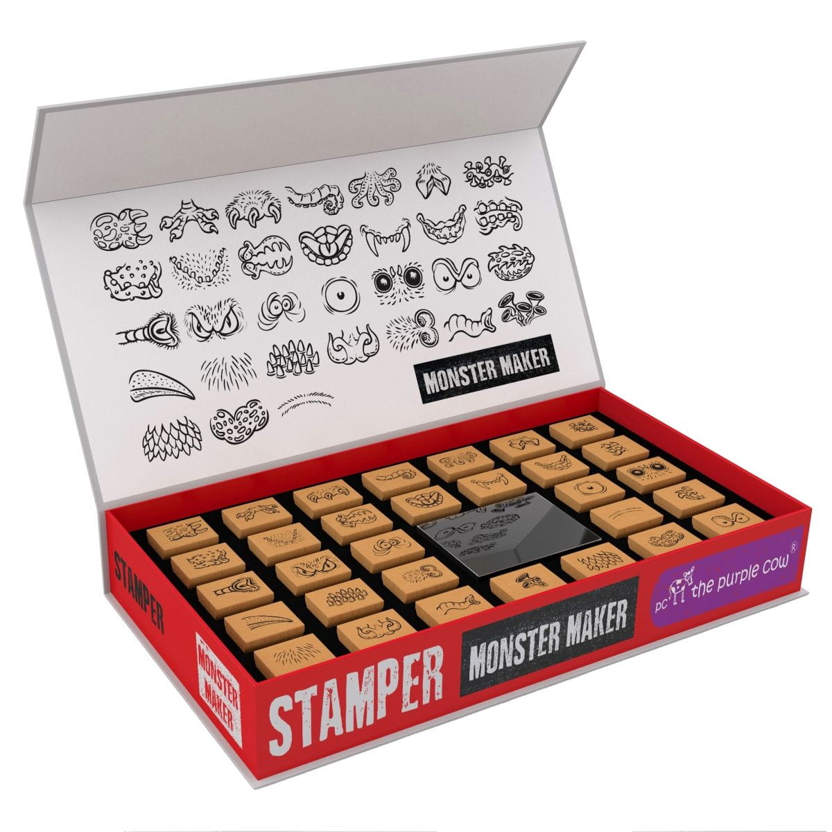 Zestaw Potwory od The Purple Cow zawiera 31 drewnianych pieczątek z częściami ciała potworków i poduszeczkę z tuszem, całość mieści się w poręcznym pudełku zamykanym na magnes.
