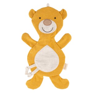 Wykonany ze 100% bawełny szeleszczący Niedźwiadek zaprasza maluchy do odkrywania, przytulania i zabawy. Płaski kształt i wyjątkowa miękkość materiału sprawiają, że zabawka zachęca do dotyku, jest łatwa do uchwycenia i trzymania przez małe rączki. Dzięki wszytej szeleszczącej folii ta pierwsza przytulanka angażuje zmysły maluszka, zapewnia bodźce dźwiękowe i wzbudza jego ciekawość. Liczne detale takie jak paski z supełkami, nogi, uszy i łapki zapewniają świetne możliwości zabawy, ssania i głaskania.