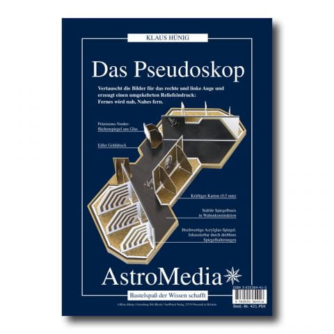 Pseudoskop skonstruował w XIX w. Charles Wheatstone, aby zgłębiać wiedzę na temat postrzegania przestrzennego. Budując model pseudoskopu z zestawu AstroMedia możemy spodziewać się niezwykłych efektów, nasz mózg bowiem nie jest przyzwyczajony do takiego odbioru, zatem zamiast pudełka stojącego na podłodze, ujrzymy dziurę w kształcie pudełka w podłodze. Fantastyczna zabawa dla osób w każdym wieku.