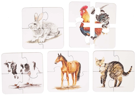Puzzle 4 elementowe Zwierzęta wiejskie Mama maluje. Układanka w nurcie Montessori. zwierzęta na białym tle. Ilustracje są zgodne z rzeczywistym wyglądem zwiarząt, namalowane przez autorkę gry.