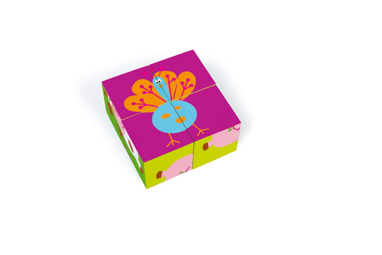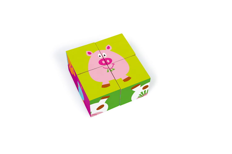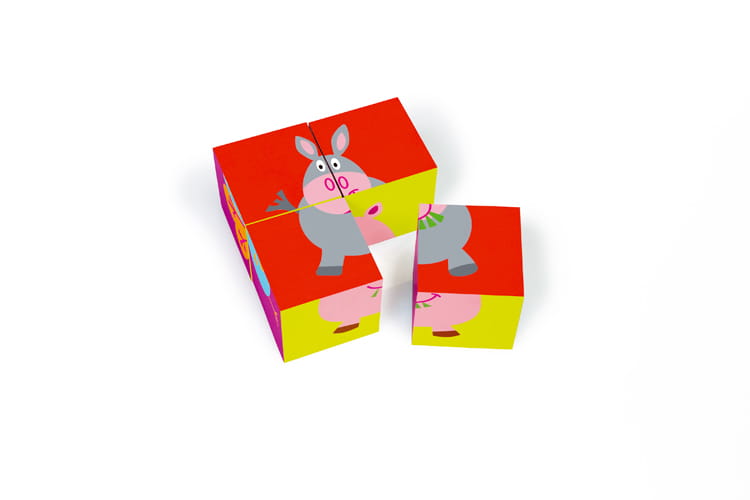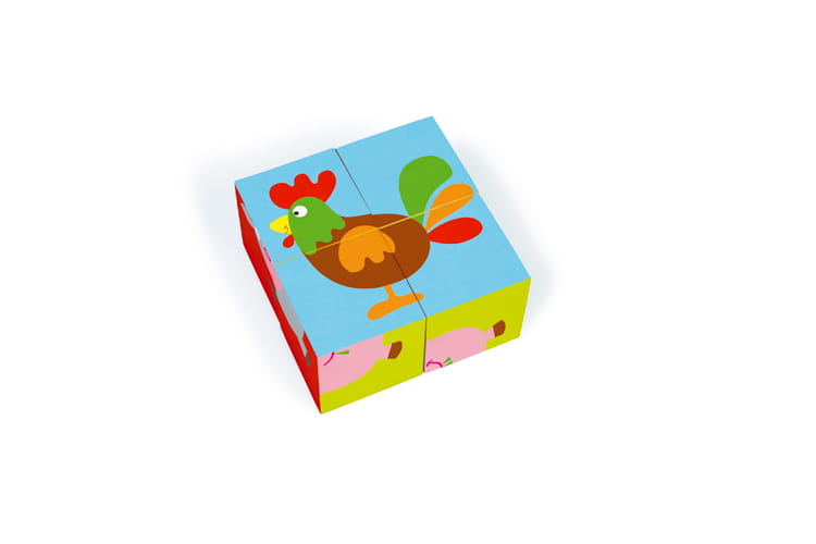 W zestawie znajdują się 4 drewniane kostki - sześciany, na których znajdują się fragmenty obrazków ze zwierzętami z farmy. Dziecko ma za zadanie ułożyć obrazek składający się z 4 elementów. Można ułożyć 6 różnych zwierząt. Klocki świetnie nadadzą się do zabawy w budowanie. To wspaniała zabawa, połączona z nauką. Puzzle rozwijają zdolności motoryczne, ćwiczą koncentrację i logiczne myślenie. Przy okazji maluch uczy się rozpoznawania kolorów, poznaje otaczający go świat i stymuluje koordynację ręka-oko.
