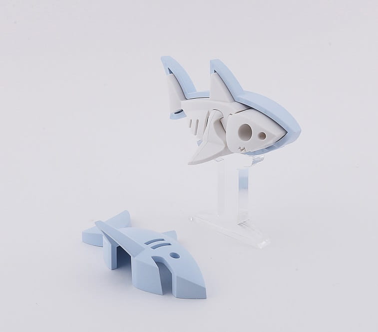 Cała zabawka składa się z 5 elementów: 2 magnetycznych połówek oraz 3 fragmentów szkieletu. Gotowego rekina można ustawić na makiecie podmorskiego świata dołączonej do zestawu, zawiera ona tło, ośmiornicę i ukwiały.