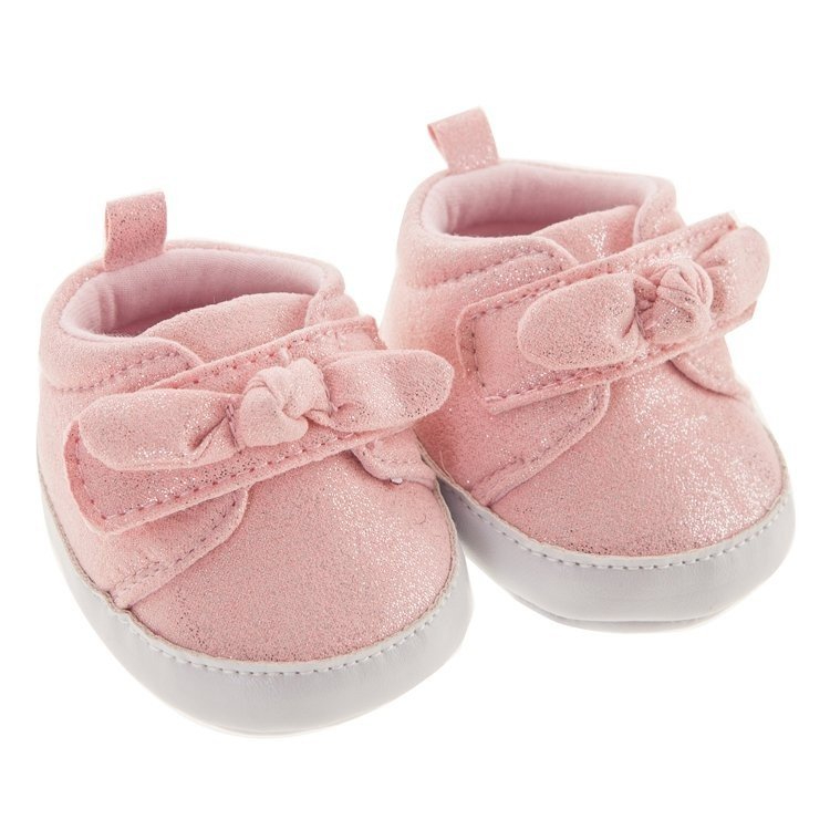 Uroczy zestaw bucików od hiszpańskiej marki Antonio Juan przeznaczony jest dla lalek o wysokości 42 cm. Podeszwę obuwia stanowi miękkie tworzywo sztuczne, a całość tworzy różowy materiał ozdobiony po całości brokatem. Dodatkowej elegancji doda uroczas kokardka. Ponadto na boku trampek znajduje się zapięcie na rzepę, co pozwoli na szybkie zakładanie oraz zdejmowanie obuwia.