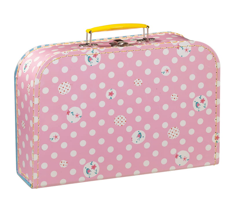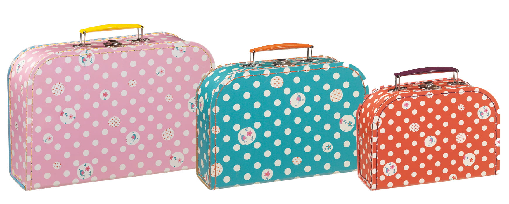 Zestaw 3 walizek wykonanych z wysokiej jakości grubej tektury, obszytej dekoracyjnym sznureczkiem. Każda walizka ma wygodną, kolorową, metalową rączkę, ułatwiającą swobodne przenoszenie. Mają też funkcjonalne zamknięcie.