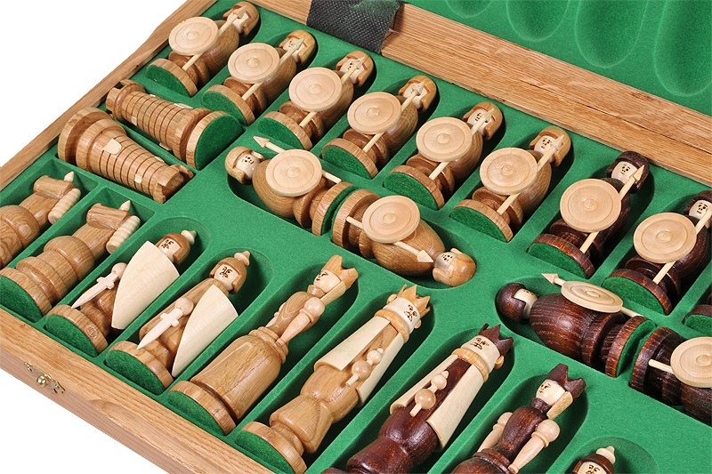 Figury szachowe w zestawie MAGNAT są unikatowe. Zostały ręcznie wykonane z trzech gatunków drewna: dębowego, jaworowego i czereśniowego.Notacja alfanumeryczna umieszczona jest na jasnych brzegach szachownicy. Składana szachownica zawiera wkładkę bardzo dobrze pasującą do figur szachowych.