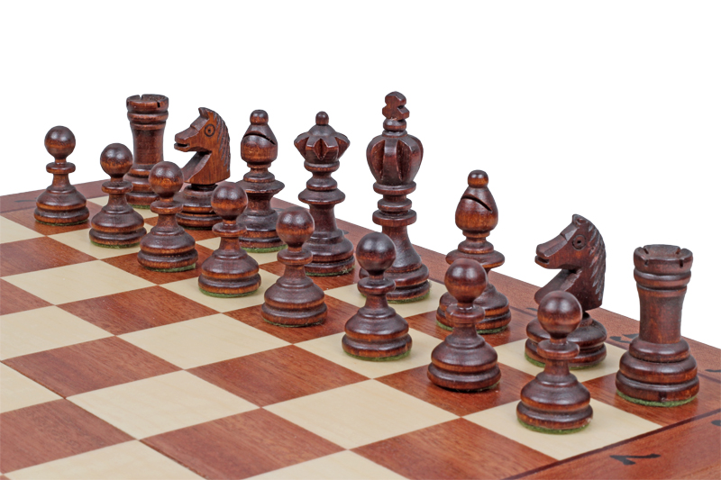 Zestaw zawiera przepiękną składaną deskę szachową, intarsjowaną mahoniowym i jaworowym drewnem. Co więcej, szachownica posiada dopasowane kieszenie na każdą figurkę, które są wyścielone filcem.