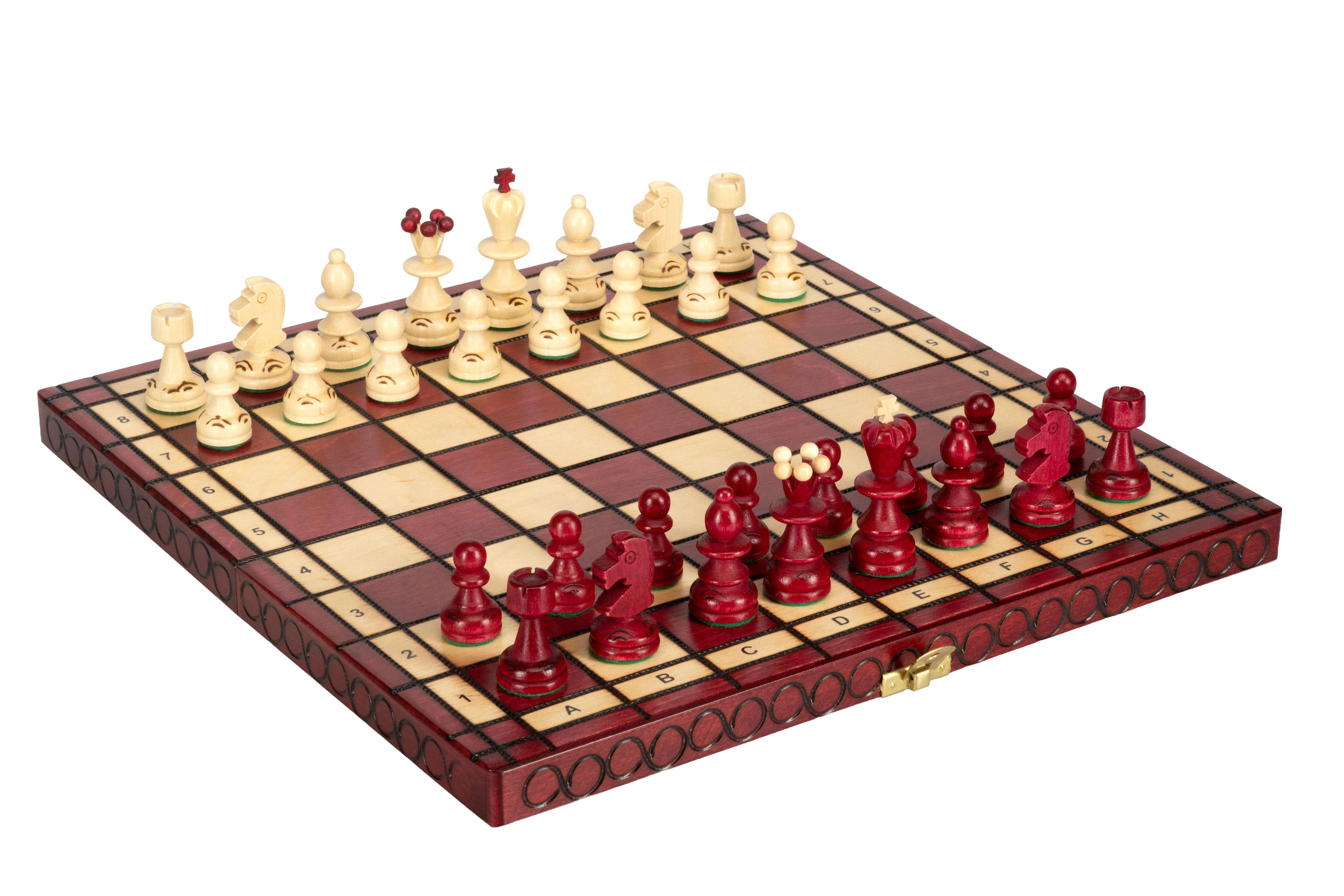 Zestaw szachów zawiera składaną drewnianą kasetkę oraz komplet 32 figur szachowych wykonanych z grabu.