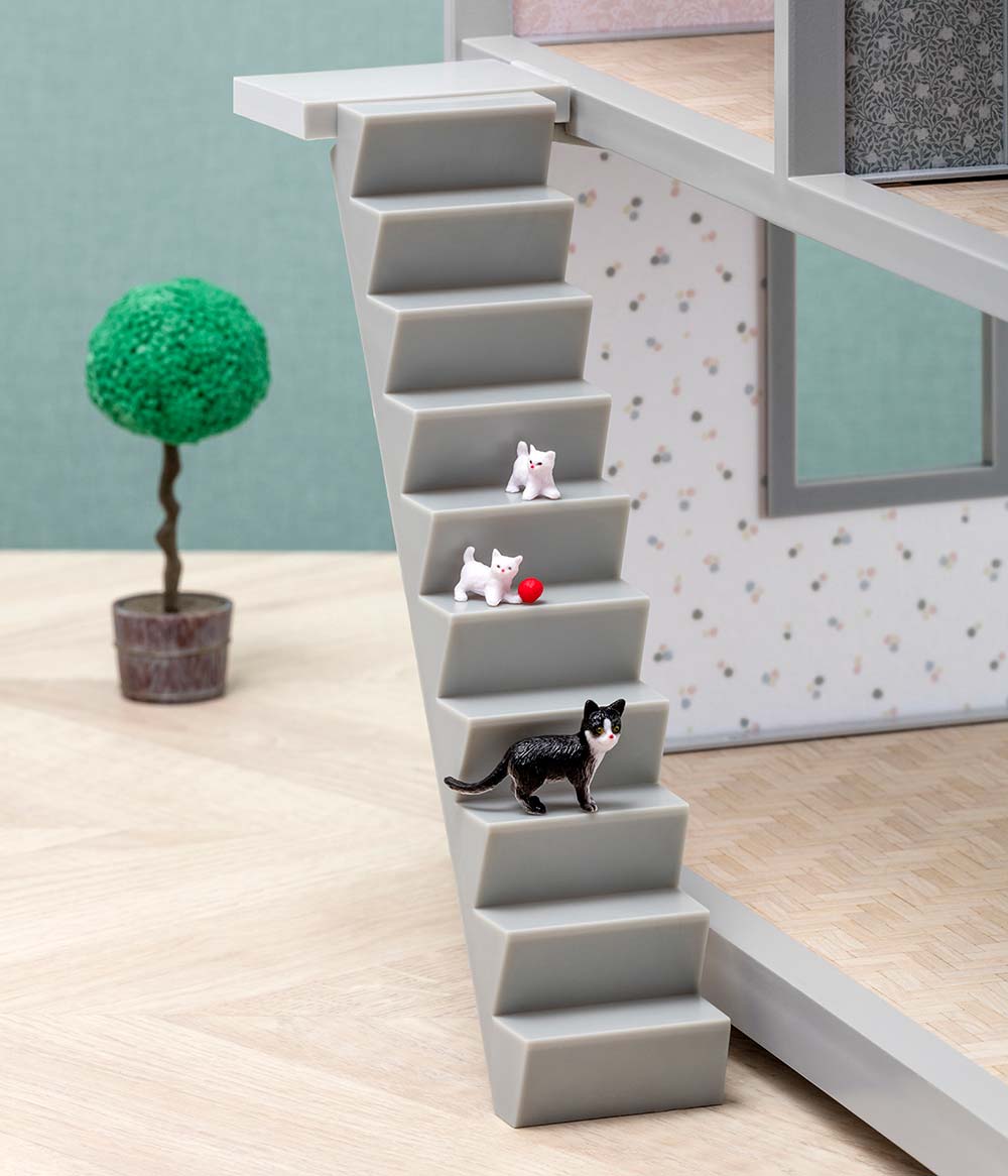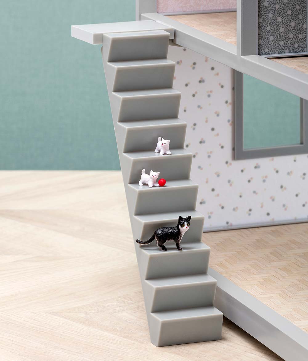 Schody do domku dla lalek szwedzkiej marki Lundby ułatwiają lalkom poruszanie się między piętrami lub poprowadzą na taras umieszczony na dachu. Wystarczy je przymocować do ramy domku i gotowe. Można też łączyć kilka zestawów schodów, jeśli w domek jest wielopiętrowy.