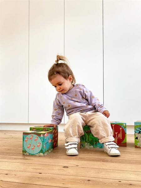 Dziecko ma za zadanie ustawić piramidę z 5 kostek kolejno zaczynając od największej tak, aby tworzyła ona logiczny ciąg składający się ze zwierzątek, postaci oraz cyfr. Oprócz tego dziecko ma możliwość takiego ustawienia kostek poziomo, jedna obok drugiej, aby odpowiednio rozmieszczone ilustracje utworzyły spójny obrazek. To wspaniała zabawa, a jednocześnie doskonała nauka.