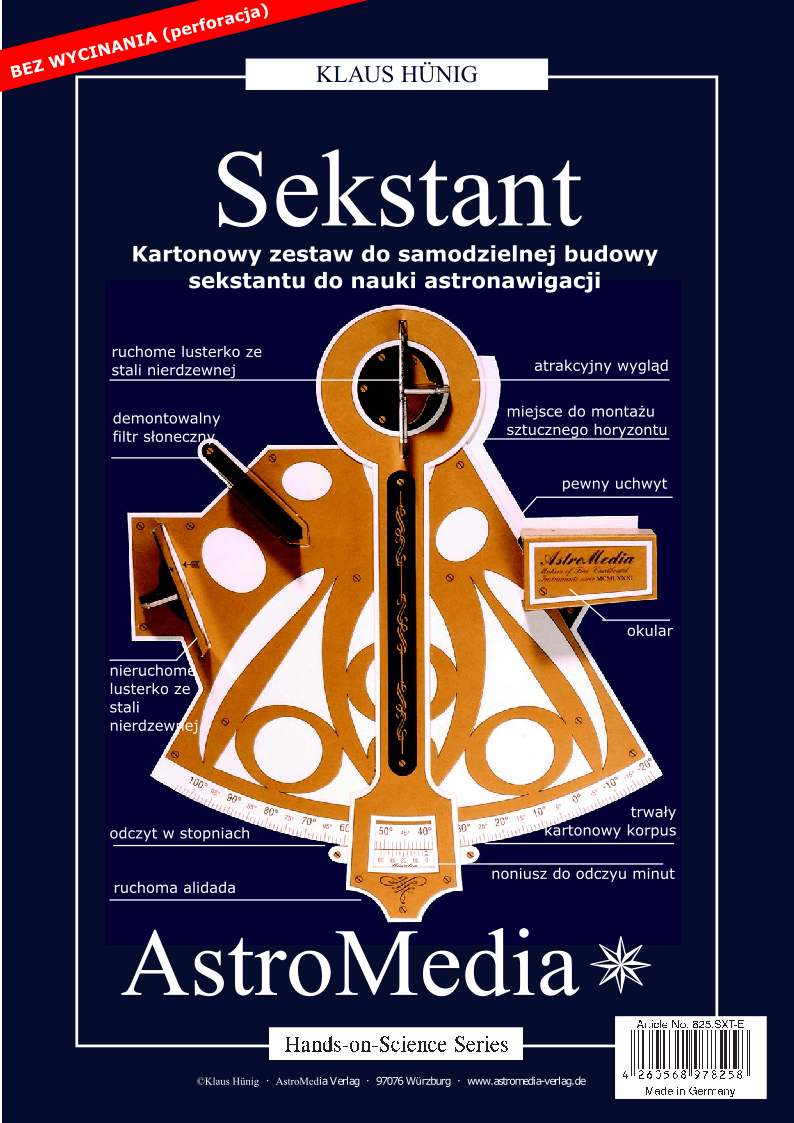 Sekstant od AstroMedia, to w pełni funkcjonalne urządzenie do samodzielnego złożenia. Pozwala na pomiary z dokładnością do 5-10 minut kątowych. Dokładność odczytu zwiększa podziałka z noniuszem. Sekstant posiada filtr słoneczny, natomiast w warunkach utrudnionej widoczności ma możliwość zamontowania sztucznego horyzontu typu "bubble horizon" (do nabycia osobno).