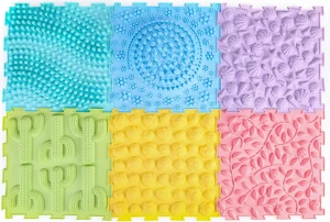 zestaw 6 płytek sensorycznych Surfloor, które można łączyć ze sobą niczym puzzle. Wymiary płytki 30 x 30 cm. Kafle sensoryczne są bardzo odporne, mogą być układane jako stała podłoga lub wykorzystywane jako przenośne panele w przedszkolach, salach zabaw, gabinetach SI.