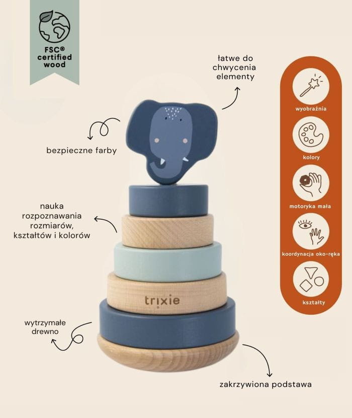 Piramida z krążków o różnej wielkości to klasyczna zabawka, zachwycają prostotą, a jednocześnie pobudzają kreatywność, oferując przy tym przyjemnie spędzony czas. Maluch musi kierować się spostrzegawczością i umiejętnością myślenia logicznego, aby ułożyć kółka wielkością od największego do najmniejszego. Zabawka jest wykonana z wysokiej jakości drewna bukowego w 100% z certyfikatem FSC©. Wszystkie farby na tym produkcie są na bazie wody.