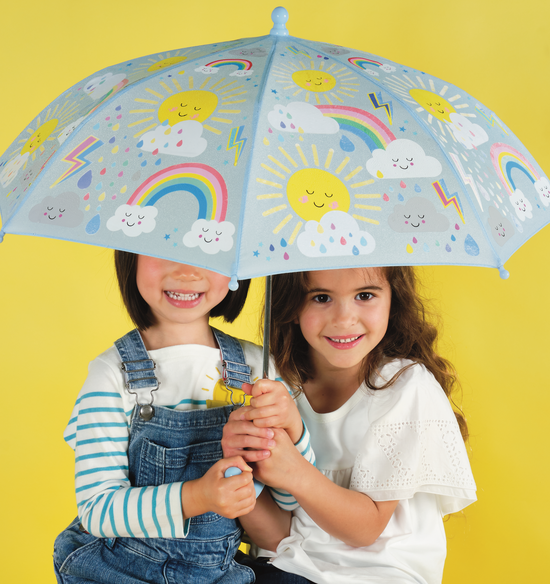 Zapewnij swojemu dziecku niezapomniane przygody podczas spacerów w deszczu dzięki magicznej parasolce zmieniającej kolory! Za każdym razem, gdy deszcz zaczyna padać, białe kształty na parasolce magicznie wypełniają się motywami słońca, tęczy i chmurek, rozweselając nawet najbardziej pochmurny dzień. Gdy parasolka wysycha, kolory wracają do bieli. W komplecie znajduje się wygodne zapięcie na rzep, które zabezpiecza złożoną parasolkę.