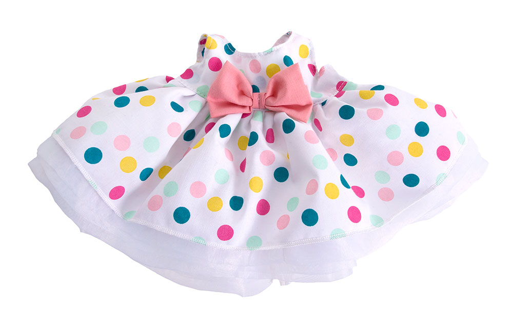 Sukienka w kropki dla lalki Rubens Barn Kids to piękna suknia odpowiednia na każdą specjalną okazję i imprezę. Sukienka jest biała w kolorowe kropki, z różową kokardą z przodu i białą wszytą halką z tiulu.