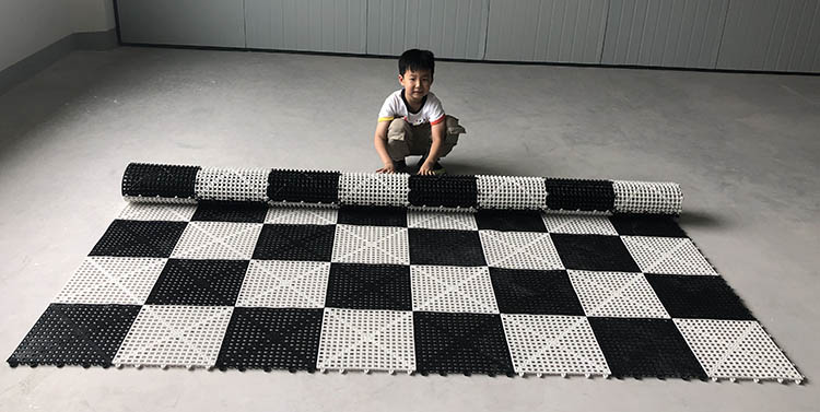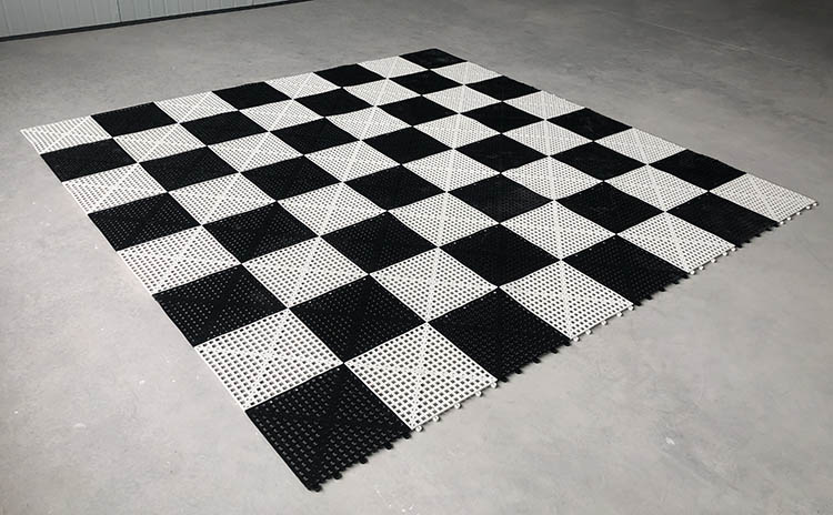Szachownica do szachów lub warcabów ogrodowych (zwanych również plenerowymi lub parkowymi), wykonana z tworzywa sztucznego/gumy. Plansza do gry jest złożona z pojedynczych pól o wymiarach 30 x 30 cm, które w całość montowane są za pomocą specjalnych zatrzasków. Dzięki temu, że każde pole wykonane jest z specjalnej gumowej siatki, jest ona w 100% odporna na działanie niekorzystnych warunków atmosferycznych. Daje to wiele możliwości, np. kiedy zacznie padać deszcz, bez obawy, że woda zaszkodzi szachom można dokończyć grę później. Szachownica idealna do naszych figur oraz pionków do warcabów ogrodowych.