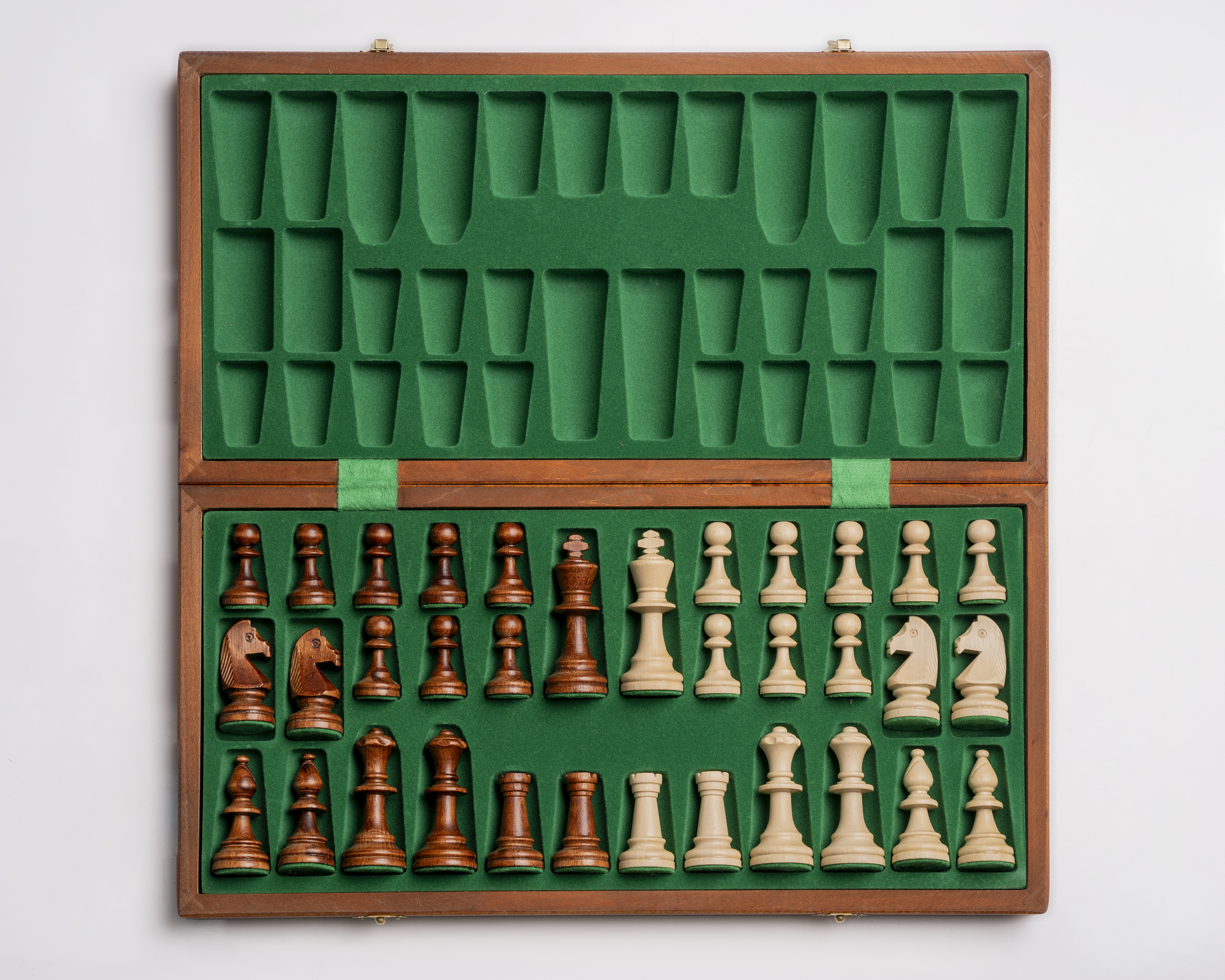 Przepiękna składana kasetka szachowa została intarsjowana mahoniem i jaworem. Wewnątrz kasetki znajduje się wkładka z wgłębieniami dopasowanymi do całego kompletu figur oraz dodatkowych hetmanów.