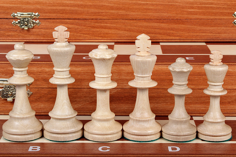 Jest to nasz większy komplet turniejowy. Zawiera obciążane figury szachowe Staunton nr 6 STAUNTON NR 6 w worku foliowym Rzeźbione Drewniane wykonane z drewna grabowego.