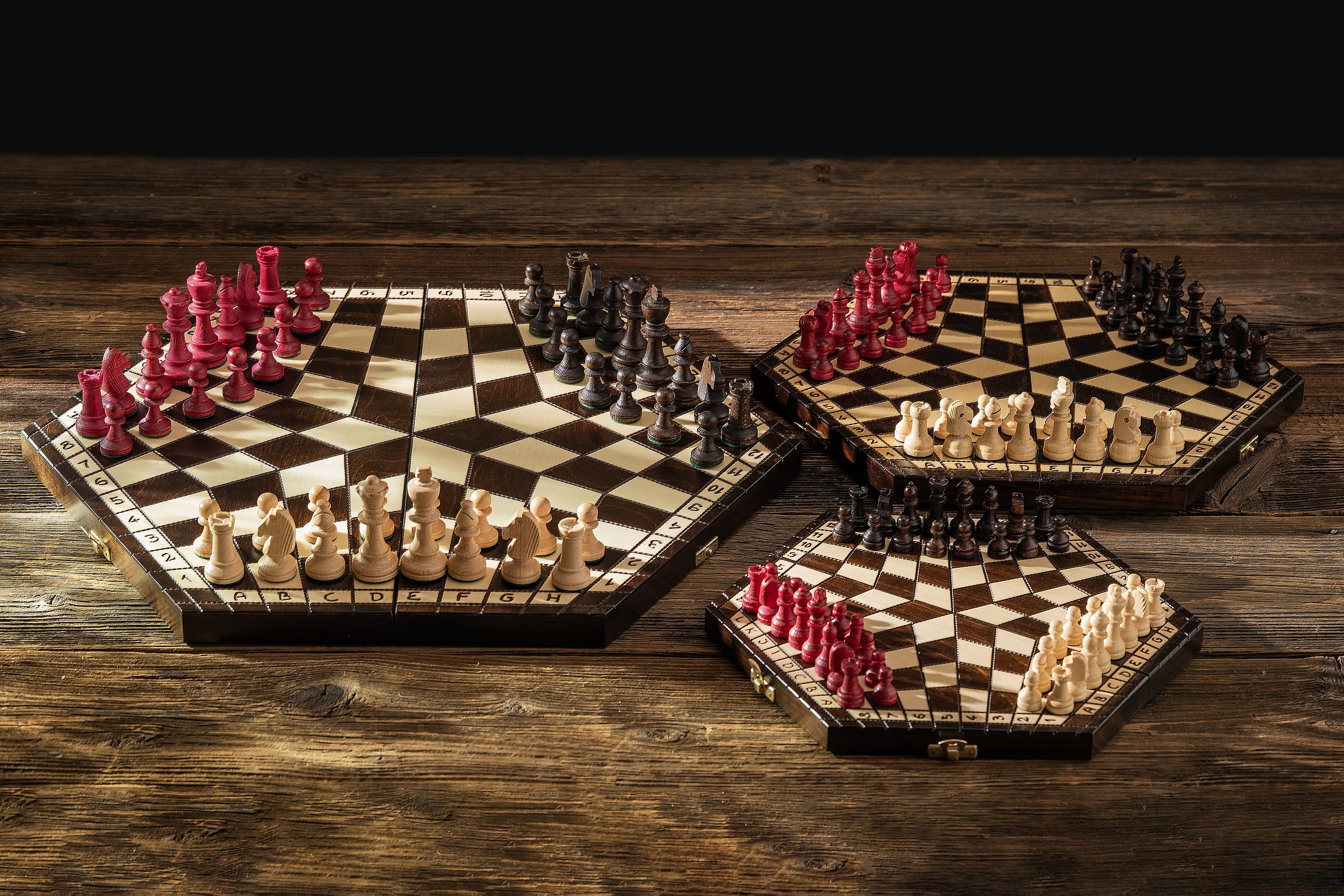 Szachy dla trójki graczy to unikalna wersja szachów składająca się ze specjalnej sześciokątnej szachownicy i trzech różnokolorowych zestawów figur, pozwalająca na rozegranie partii przez 3 osoby równocześnie.