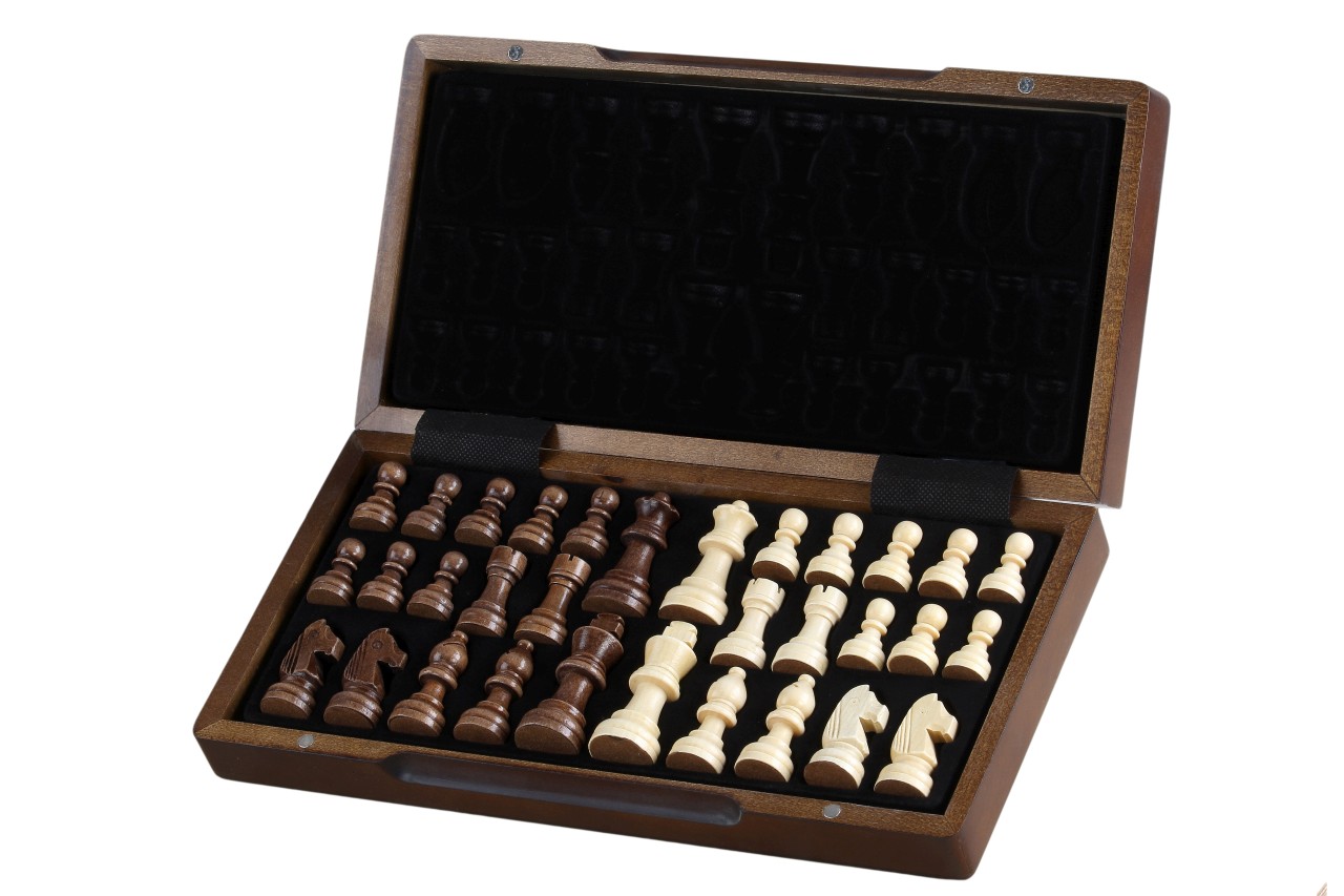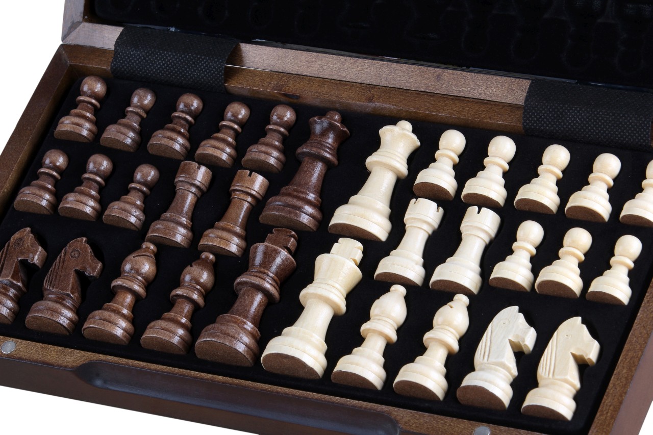 Szachy magnetyczne intarsjowane orzechem i klonem. Rozmiar szachownicy 31x31 cm po rozłożeniu. Szachy charakteryzują się bardzo eleganckim wyglądem, figury dociążone magnesami wykonano na wzór turniejowych Stauntonów.
