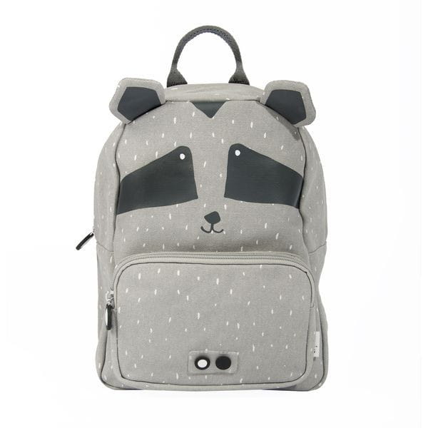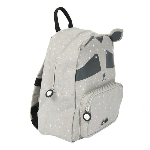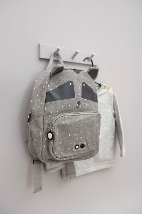 Ma małą kieszonkę z przodu i dużą komorę z małą przegródką w środku i miejscem do zapisania np. imienia dziecka, numeru telefonu.