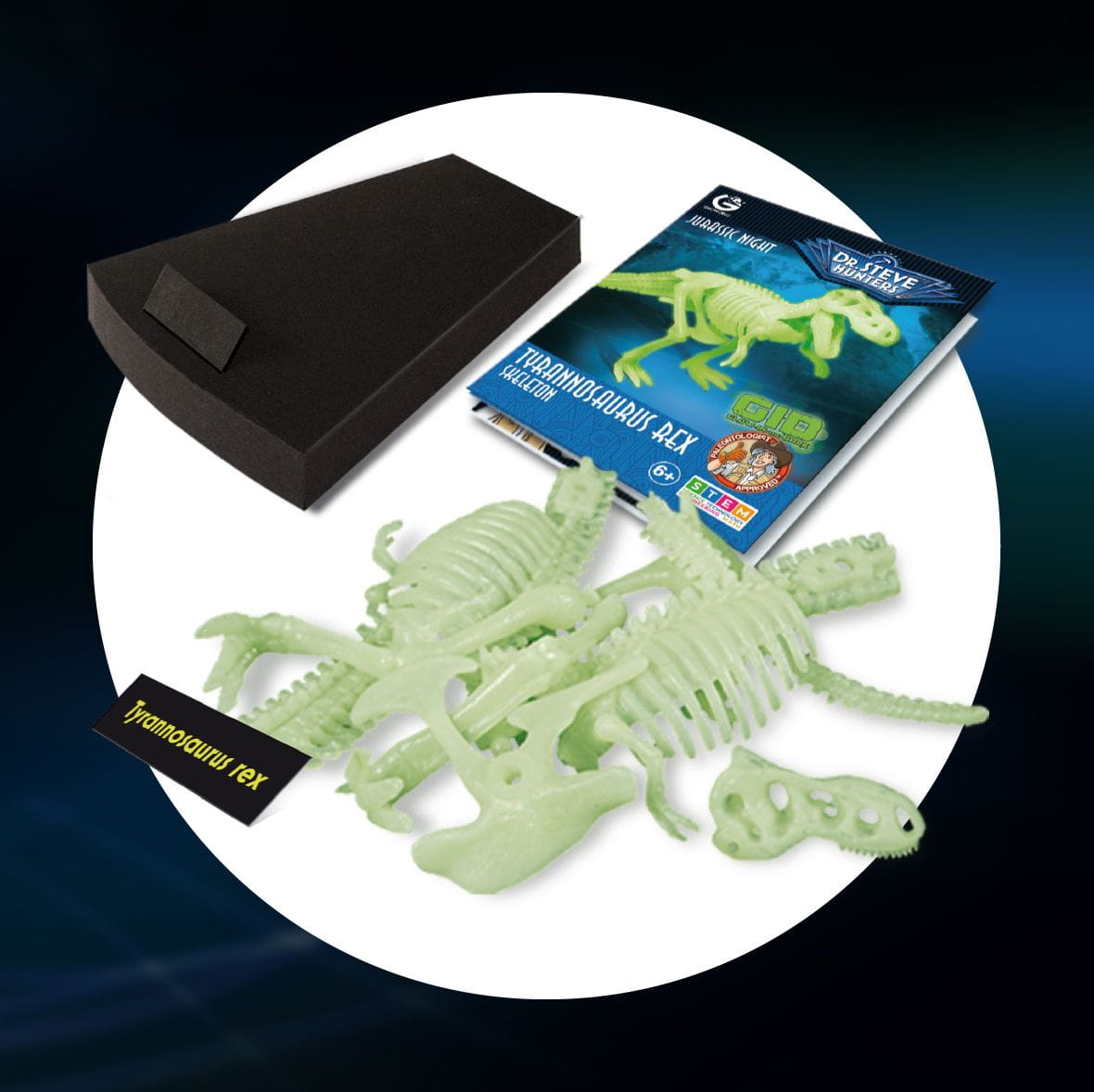 Szkielet dinozaura T-REX do samodzielnego złożenia. Model GEO1651 od Geoworld to replika prehistorycznego gada tyranozaura, który świeci w ciemności. Model składa się z 13 elementów, do zestawu dołączona jest instrukcja graficzna. Figurkę można postawić na specjalnej podstawce z nazwą dinozaura (w komplecie), a później przeczytać informacje o nim z dołączonej broszurki.