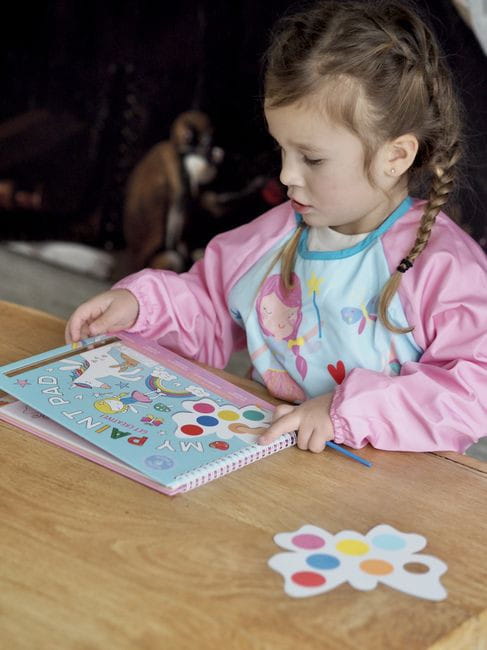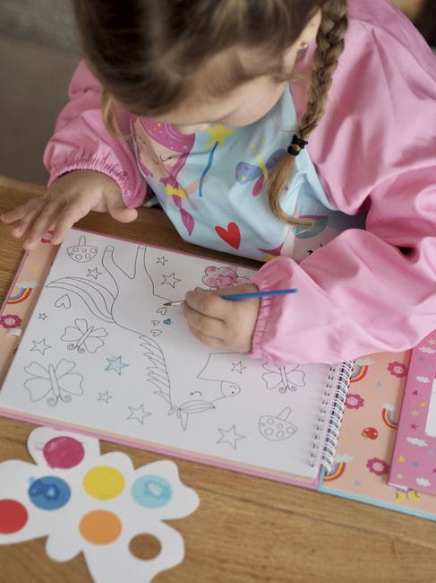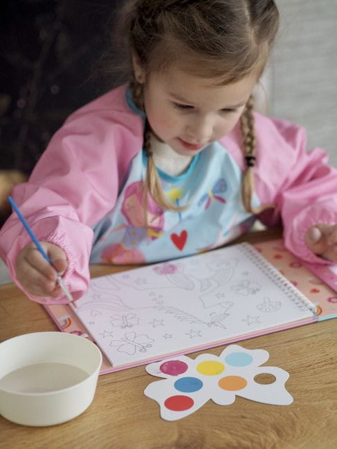 Zestaw kreatywnych kolorowanek z farbkami zawiera 8 wspaniałych obrazków z motywem tęczowych wróżek do pomalowania oraz 8 palet farbek w kształcie motylka, a także praktyczny pędzelek. Za pomocą delikatnego pociągnięcia pędzelka nawilżonego niewielką ilością wody i farbki można namalować swój własny obrazek! Palety z farbkami i pędzelek są bezpiecznie przechowywane w spiralnie oprawionej okładce, gdy nie są używane, dzięki czemu kolorowanki idealnie nadają się do malowania w podróży!