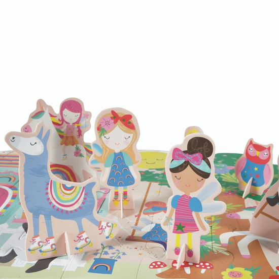 Puzzle Tęczowe Wróżki to piękny zestaw puzzli z figurkami zapewniający dzieciom ciekawą i rozwijającą rozrywkę. Zestaw składa się z 60 elementów, które tworzą układankę przedstawiającą bajkowy świat oraz 16 figurek na stojakach. Wróżki, kolorowa sowa, niedźwiadek hula hop, lama na rolkach i inne zwierzaki są zawsze gotowe na rozpoczęcie zabawy i przeżywać najróżniejsze przygody. Po jej zakończeniu puzzle i figurki można schować do poręcznego pudełka z wygodnym uchwytem. Puzzle świetnie wpływa na rozwój zdolności manualnych, uczą cierpliwości, koncentracji i spostrzegawczości.