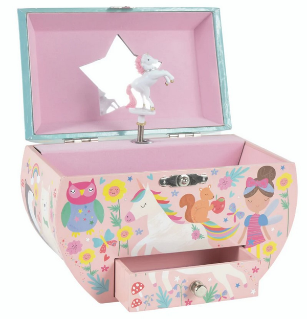 Owalna szkatułka marki Floss & Rock na cenne dziecięce drobiazgi z poręczną szufladką, ozdobiona wspaniałymi ilustracjami wróżek, jednorożców, tęczy i innych magicznych postaci. Nakręć kluczyk z tyłu, a po otwarciu szkatułki zobaczysz magicznego jednorożca wirującego w rytm przepięknej melodii „You Are My Sunshine”. Szkatułka jest wykonana z wielką dbałością o szczegóły i zapakowana w ozdobne pudełko, co czyni ją idealnym prezentem dla dziewczynek.