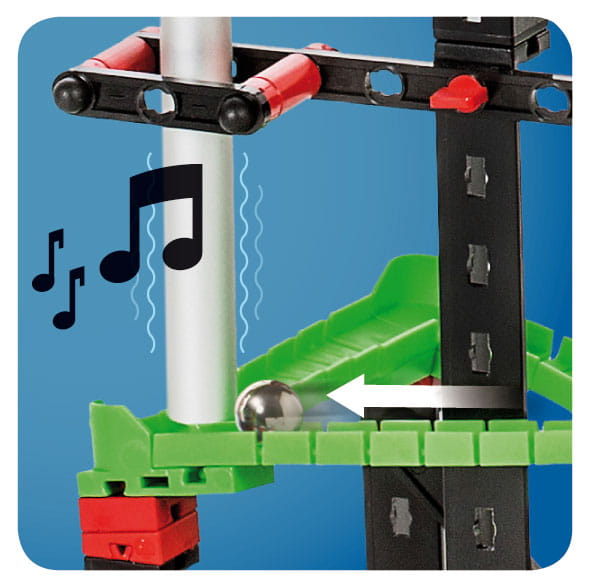 Części wywołujące akcje oraz wydające dźwięki otwierają mnóstwo możliwości budowania ciekawych konstrukcji dla stalowych kuleczek. Podczas zjazdu kuleczki uderzają dzwonki rurowe i wydobywają miłe dźwięki. Leje to zupełnie nowy sposób na przenoszenie kulek na niższy poziom. Kulki również strzelają i przelatują nad przeszkodami przez wąskie zakręty 90 st. oraz skrzyżowania. Gdy dotrą na sam dół, ręczna winda łańcuchowa zabierze je z powrotem na górę. Zestaw konstrukcyjny Dynamic M jest idealny do tworzenia ekscytujących tras dla kuleczek. W zestawie instrukcja do budowy 4 różnych torów, ale modyfikując je można uzyskać zupełnie nowe kombinacje.