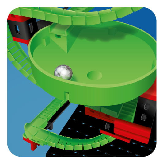 Wykorzystując elementy tego zestawu możesz zbudować 4 różne tory dla kulek, zawierające ruchome elementy i rozmaite mechanizmy.