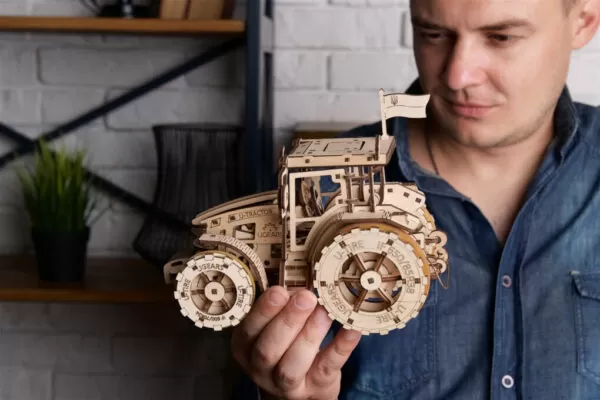 Drewniane puzzle 3D marki Ugears wiernie naśladują rzeczywiste mechanizmy. Poszczególne elementy są wykonane ze sklejki i wystarczy je wycisnąć i delikatnie przetrzeć papierem ściernym, aby otrzymać idealnie dopasowane do reszty detale. Dbałość o szczegóły na etapie produkcji, zapewnia prawdziwą przyjemność podczas składania oraz satysfakcję z wyglądu i funkcjonalności gotowego mechanizmu.
