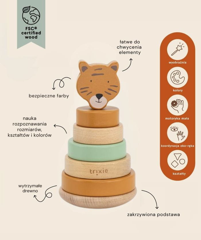 Piramida z krążków o różnej wielkości to klasyczna zabawka, zachwycają prostotą, a jednocześnie pobudzają kreatywność, oferując przy tym przyjemnie spędzony czas. Maluch musi kierować się spostrzegawczością i umiejętnością myślenia logicznego, aby ułożyć kółka wielkością od największego do najmniejszego. Zabawka jest wykonana z wysokiej jakości drewna bukowego w 100% z certyfikatem FSC©. Wszystkie farby na tym produkcie są na bazie wody.
