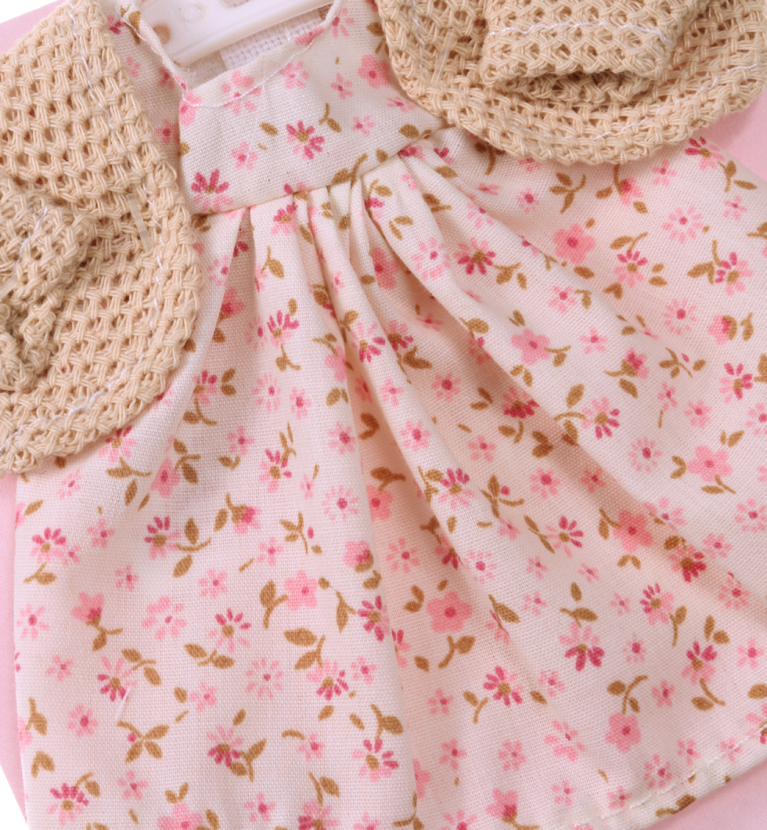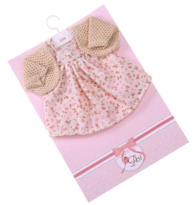 Sukienka ze sweterkiem jest przeznaczona dla lalki o wysokości 20 cm. Komplet uzupełnia kolekcję ubranek hiszpańskiej marki ASI. Sukienkę w kremowym kolorze uszyto na krótki rękaw i ozdobiono drobnymi kwiatuszkami. Strój uzupełnia beżowy sweterek z dzianiny. Bolerko przyda się do otulenia lali szczególnie w chłodniejsze dni. Całość urzeka, mięciutkim i przyjemnym w dotyku materiałem.
