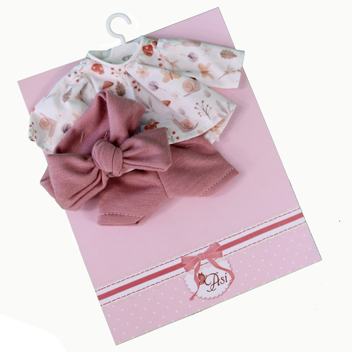 Koszula ze spodenkami 3117080 przeznaczona jest dla lalki o wysokości 20 cm. Komplet uzupełnia kolekcję ubranek hiszpańskiej marki ASI. Białą koszulę z zestawu zdobi wzór w drobne kolorowe motylki. Strój uzupełnią krótkie, spodenki w kolorze pudrowego różu oraz opaska na głowę z uroczą kokardą.