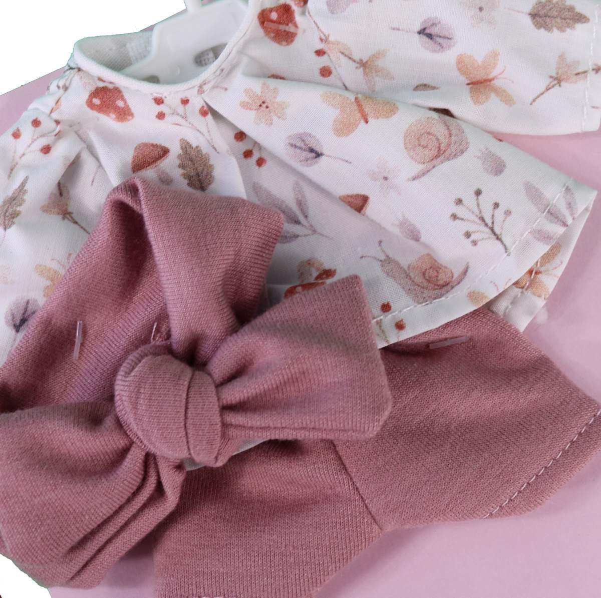 Pastelowy strój zaczepiony jest na plastikowym mini wieszaku, a całość zapakowana w przezroczystą folię, która posłuży nam do przechowywania zestawu.