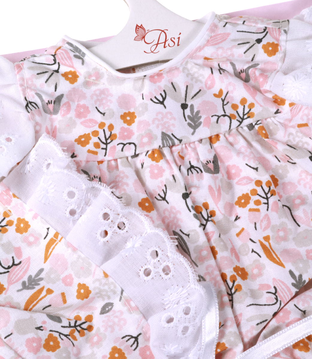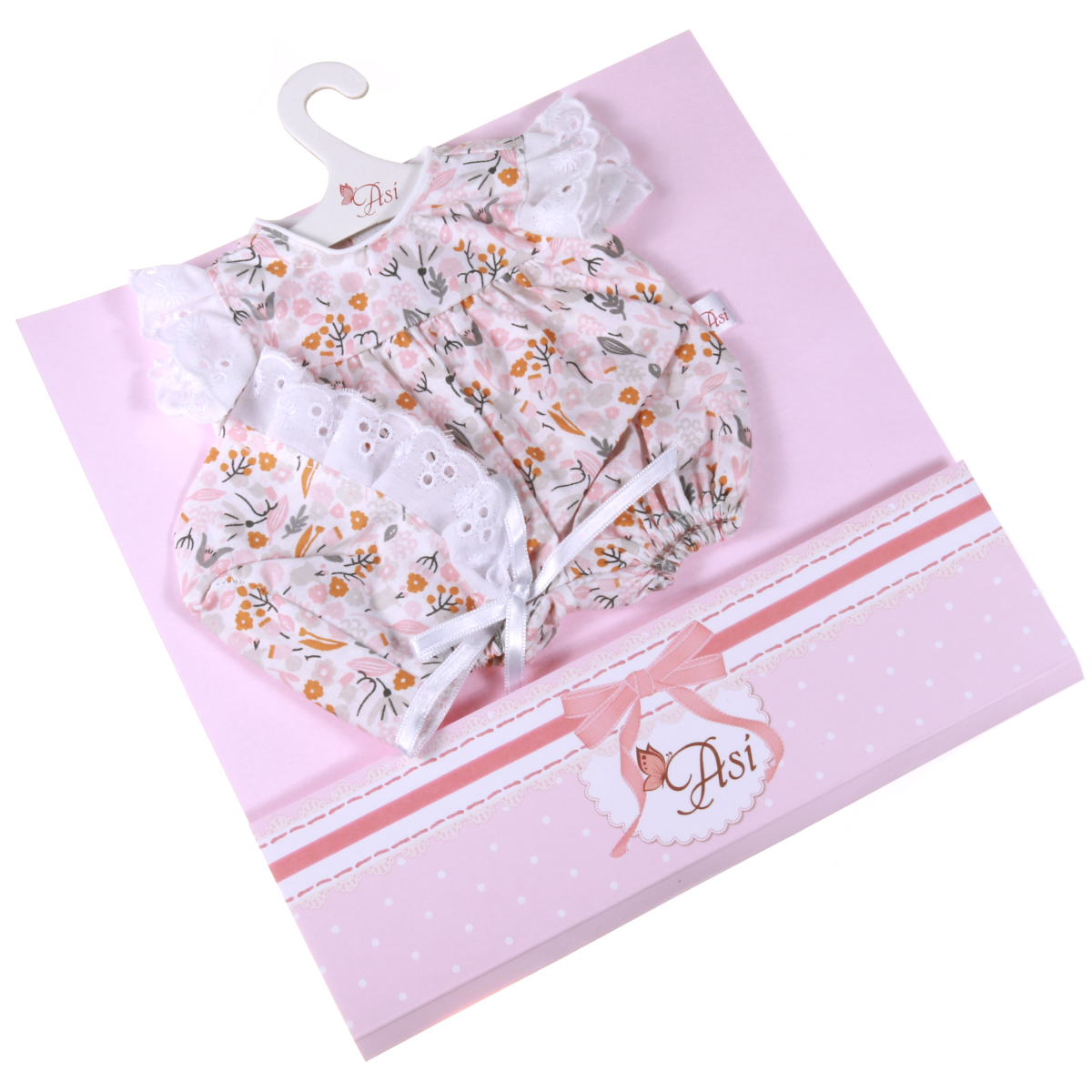 Strój składa się z białych bodów na krótki rękaw oraz wiązanej czapeczki. Ubranko wykonano z przyjemnego w dotyku materiału i ozdobione zostało motywem w kolorowe kwiaty. Wykończenia rękawów stanowią białe ażurowe wstawki, które sprawią, że w całości strój komponuje się doskonale. W ubranku nogawki zakończono gumeczkami, a dzięki temu świetnie będą leżały na nóżkach dziewczynki i w całości strój na hiszpańskiej laleczce będzie pięknie się prezentował. Wiązana czapeczka została również wykończona białą ażurową wstawką, którą został obszyty po całości dodatek.