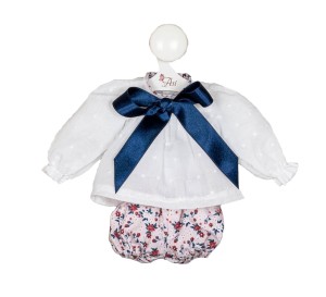 Elegancki komplet ubranek od hiszpańskiej marki Asi odświeży szafę lali o wysokości 40 cm. Strój będzie świetnie prezentował się na sylwetce filigranowej dziewczynce o imieniu Sabrina. Komplet składa się z krótkich bufiastych spodenek i koszuli na długi rękaw. Białą bluzeczkę wykonano ze zwiewnego materiału i ozdobiono nakrapianym wzorem.Ubranko wyposażono w zapięcie na rzepę umieszczoną z tyłu ciuszka. Dopełnieniem stylizacji będzie granatowa, atłasowa wstążeczka, którą można wiązać na kokardkę na szyi lali. Z uwagi na wszelkie restrykcje producent zaleca ubranko do zabawy dla dzieci powyżej 3 roku życia. Jeśli dojdzie do wybrudzenia ubranko można wyprać.