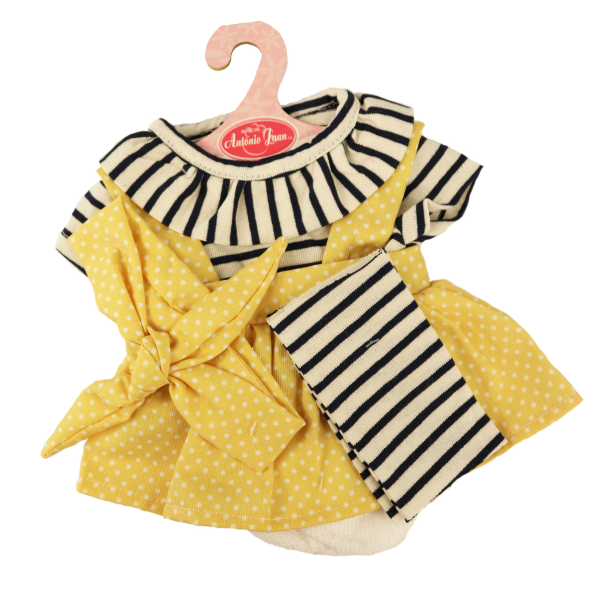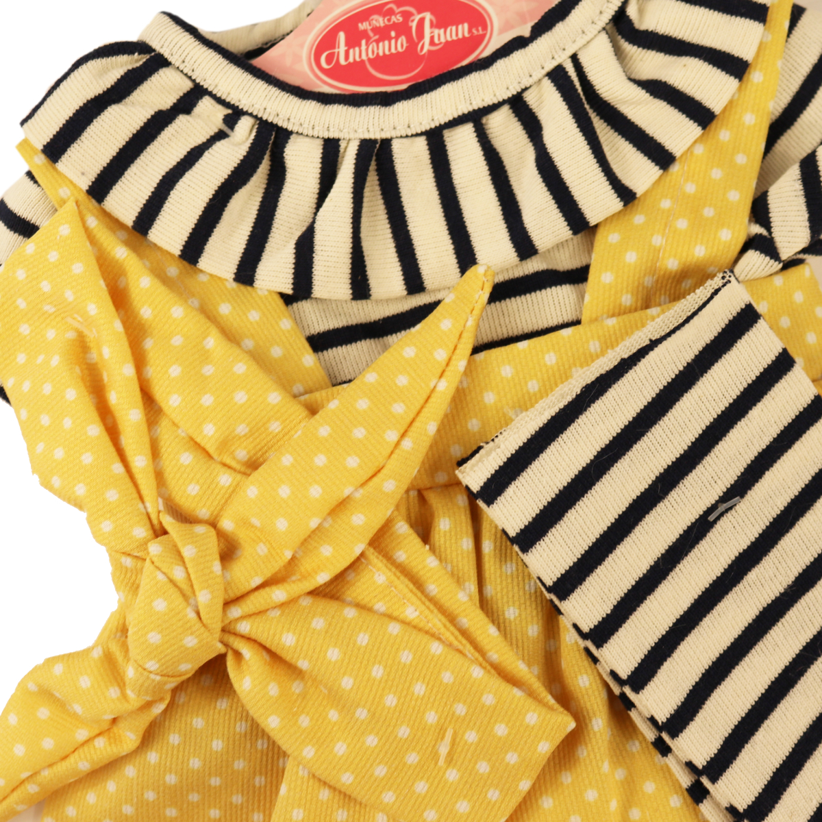 W asortymencie marki Antonio Juan pojawiły się stroje dla lalki o wysokości 45 cm. Letni komplet odświeży szafę Belli. Strój składa się z bluzeczki w paski na krótki rękaw, żółtego sarafana i opaski na głowę. Spódnica z szelkami we wzór w białe groszki to idealny strój na wakacyjny dzień. Zwiewne ubranka i dobrane kolory idealnie podkreślą urodę Belli. Ubiór uzupełniają ocieplacze na nóżki i białe wełniane majteczki. Kreację wyposażono w zapięcie na rzepę umieszczoną z tyłu ubranka. Z uwagi na wszelkie restrykcje producent zaleca ubranko do zabawy dla dzieci powyżej 3 roku życia. Jeśli dojdzie do wybrudzenia, ubranko można prać ręcznie.