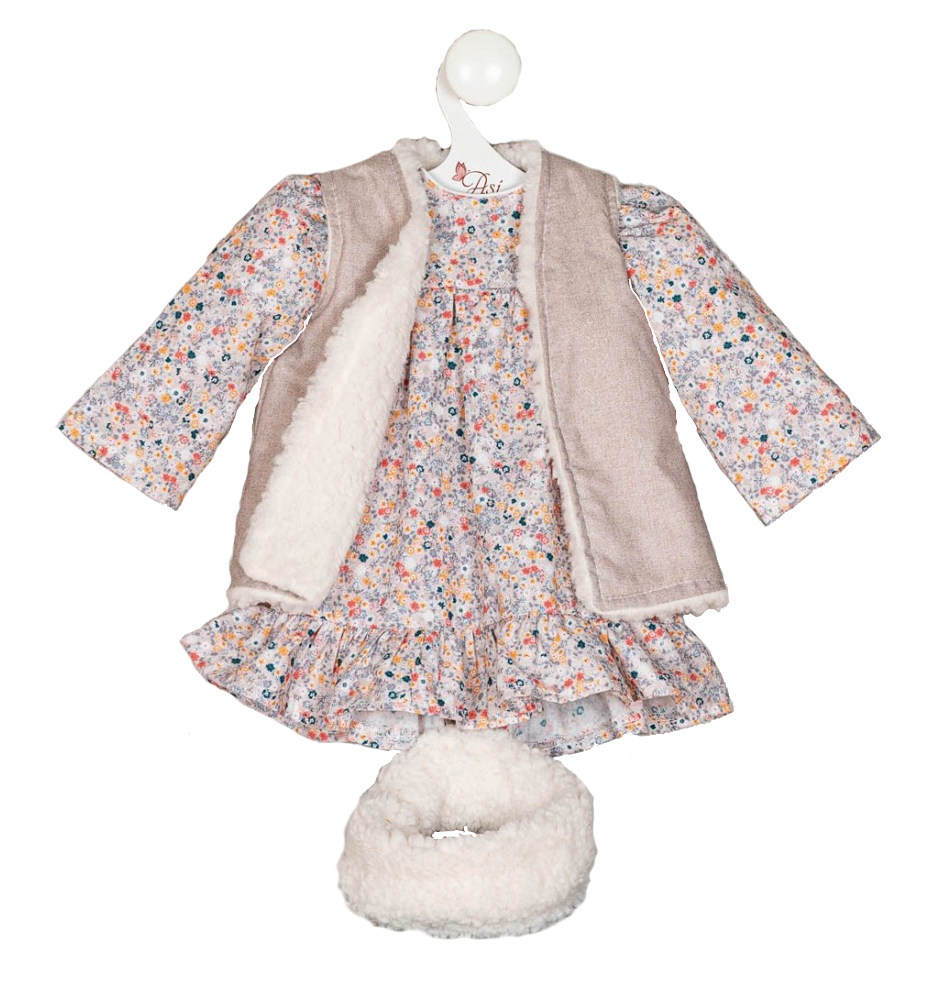 Kwiecista kreacja z długim rękawkiem to kolejne ubranko, którego nie moze zabraknąć w szafie hiszpańskiej lali o imieniu Pepa. Dodatkowej elegancji doda zakończenie dołu falbanką. Komplet uzupełni dwustronna kamizelka wykonana z owczej skóry i biała futrzana opaska na głowę.