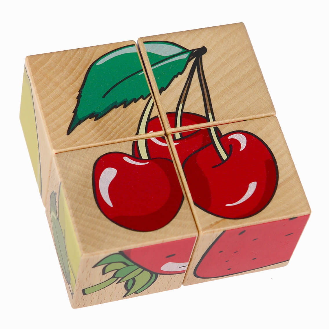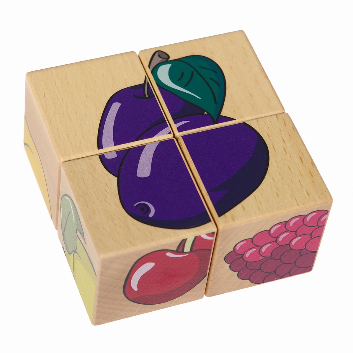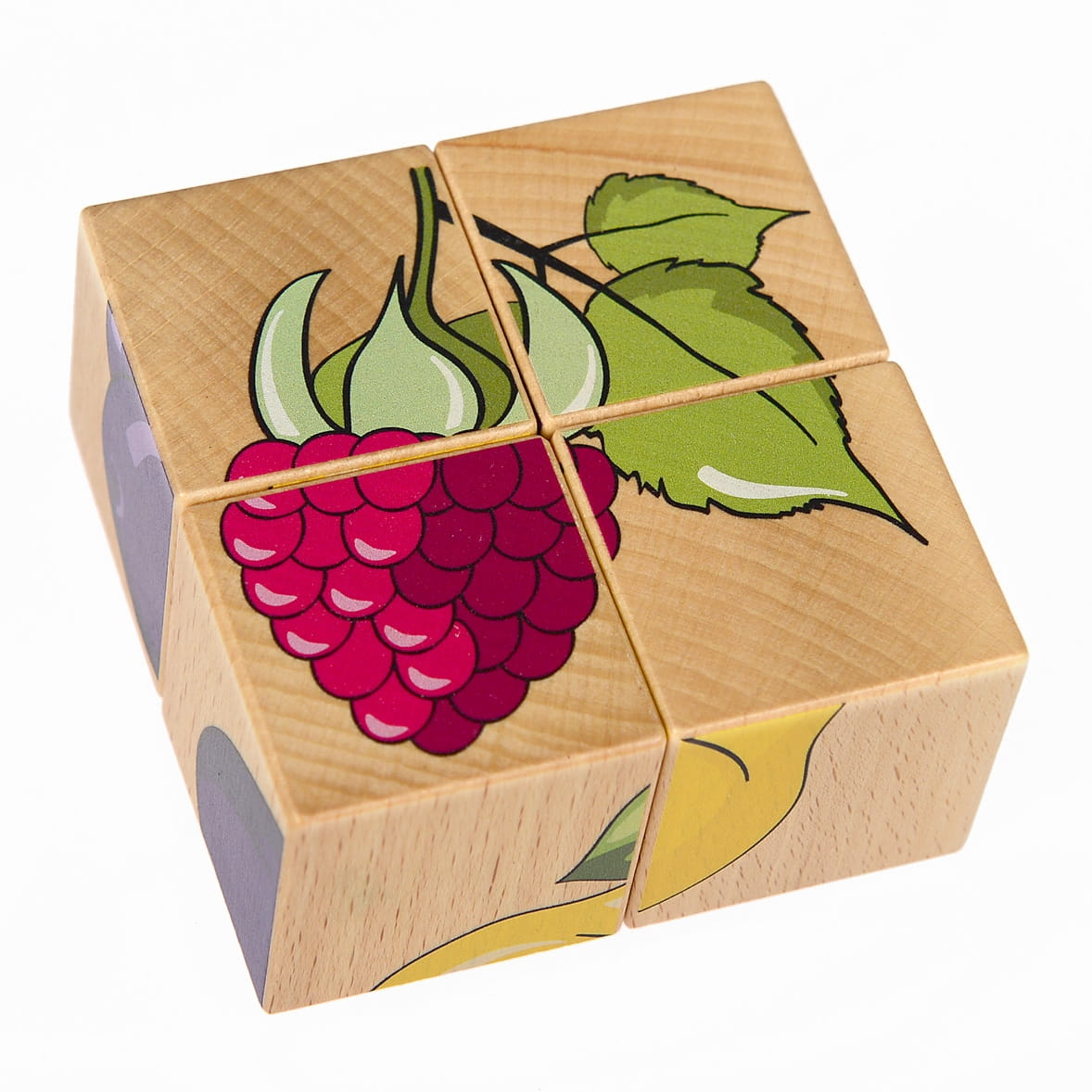 W zestawie 4 klocki w kształcie sześcianów. Na każdej stronie znajduje się element innego obrazka przedstawiającego owoc. Do wyboru mamy wiśnie, jabłko, gruszka , śliwka, malina , truskawka.