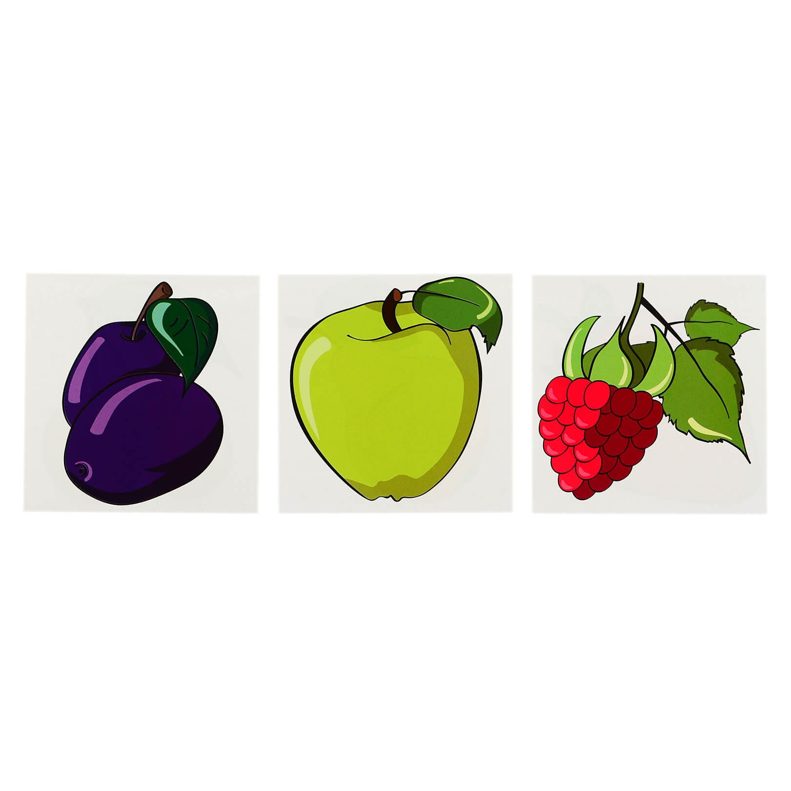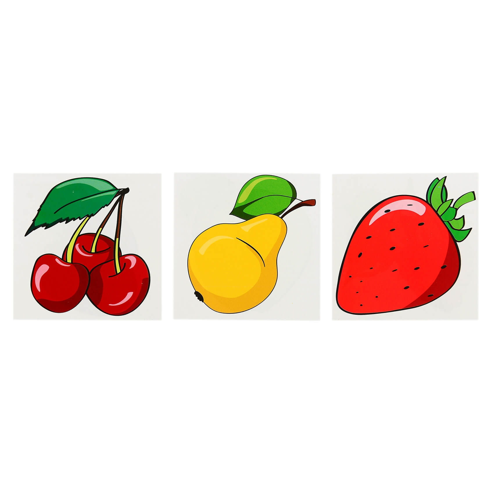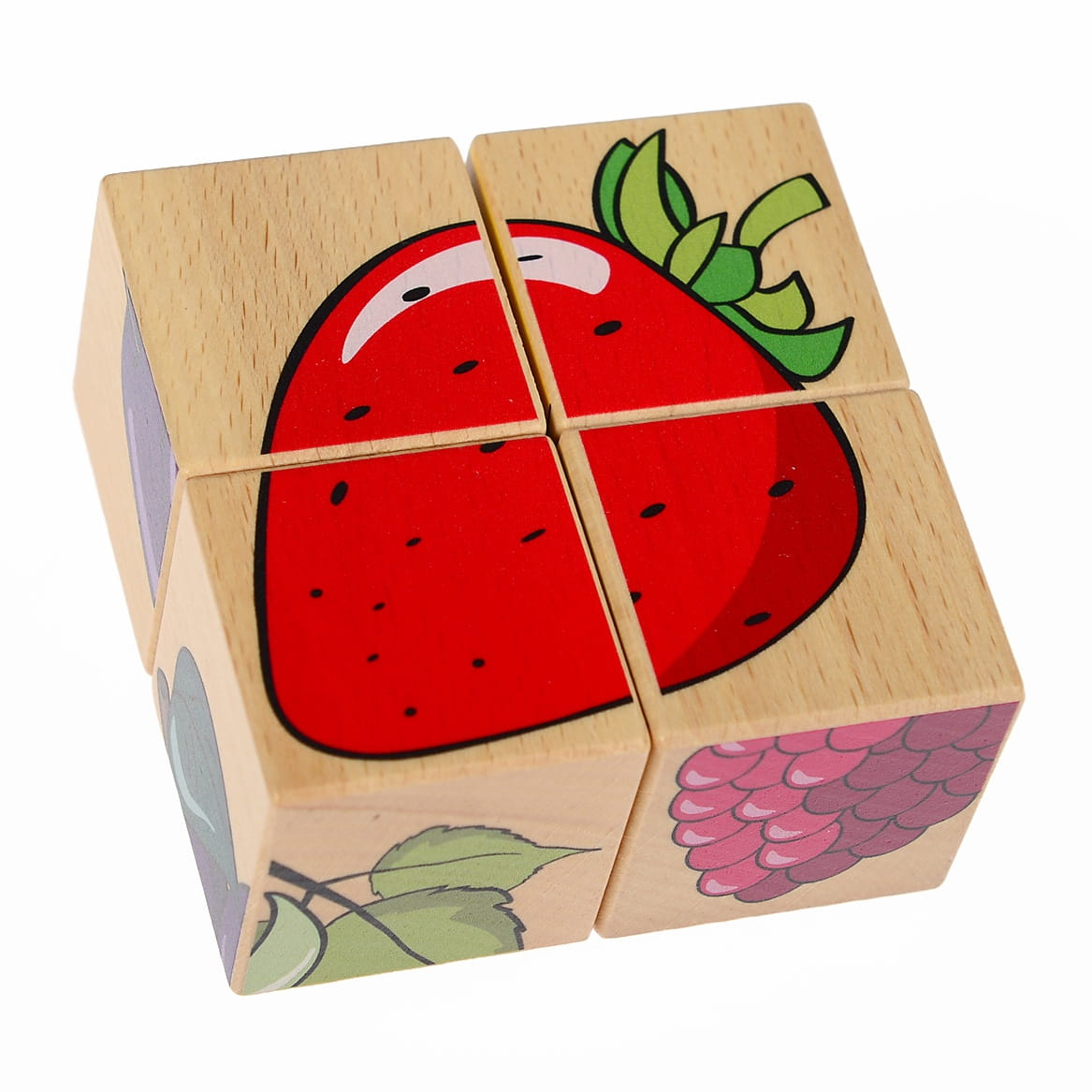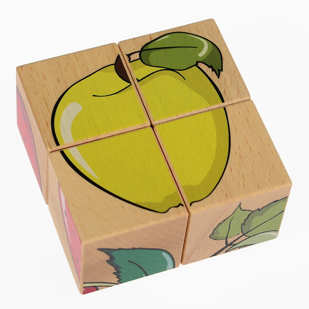 W zestawie 4 klocki w kształcie sześcianów. Na każdej stronie znajduje się element innego obrazka przedstawiającego owoc. Do wyboru mamy wiśnie, jabłko, gruszka , śliwka, malina , truskawka.