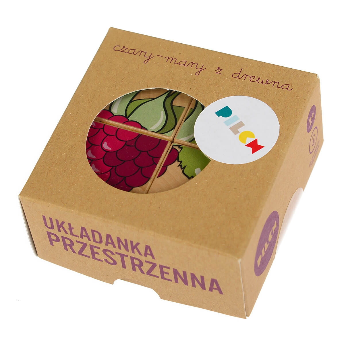 Drewniane klocki układanka z 6 różnymi owocami wykonane przez polską firmę Pilch.