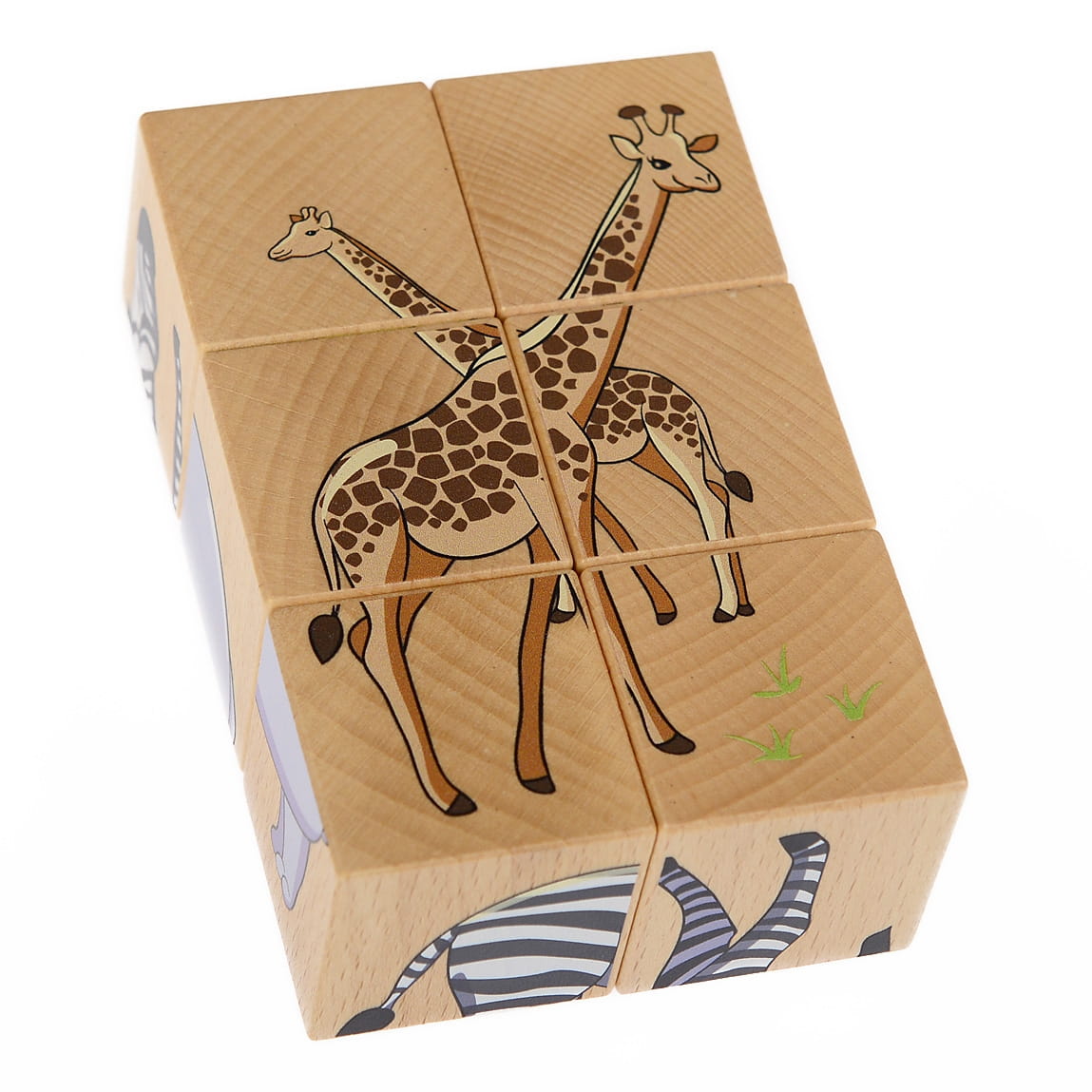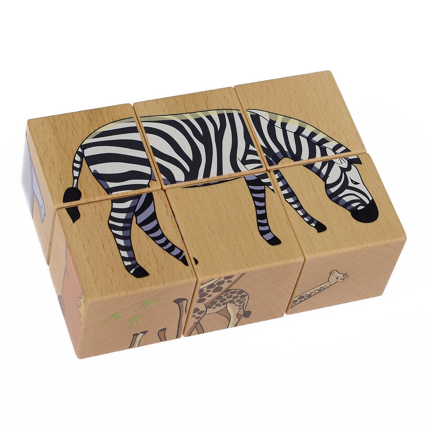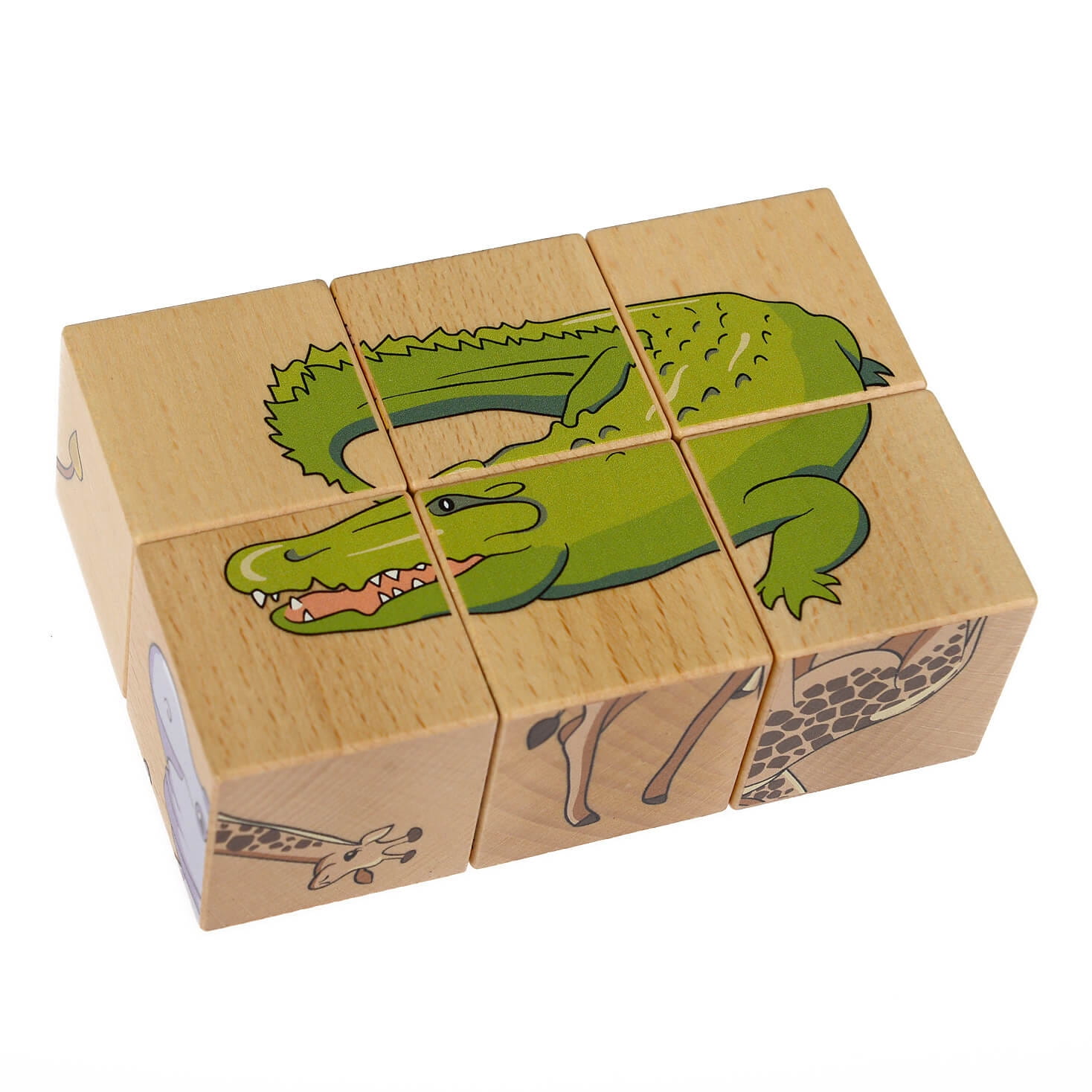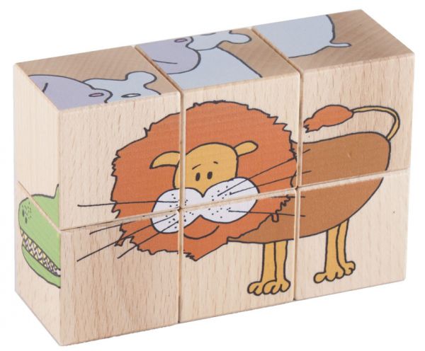 W zestawie 6 klocków w kształcie sześcianów. Na każdej stronie znajduje się element innego obrazka przedstawiającego zwierzę z Safari, m.in. lwa, małpkę, słonia, krokodyla, hipopotama.