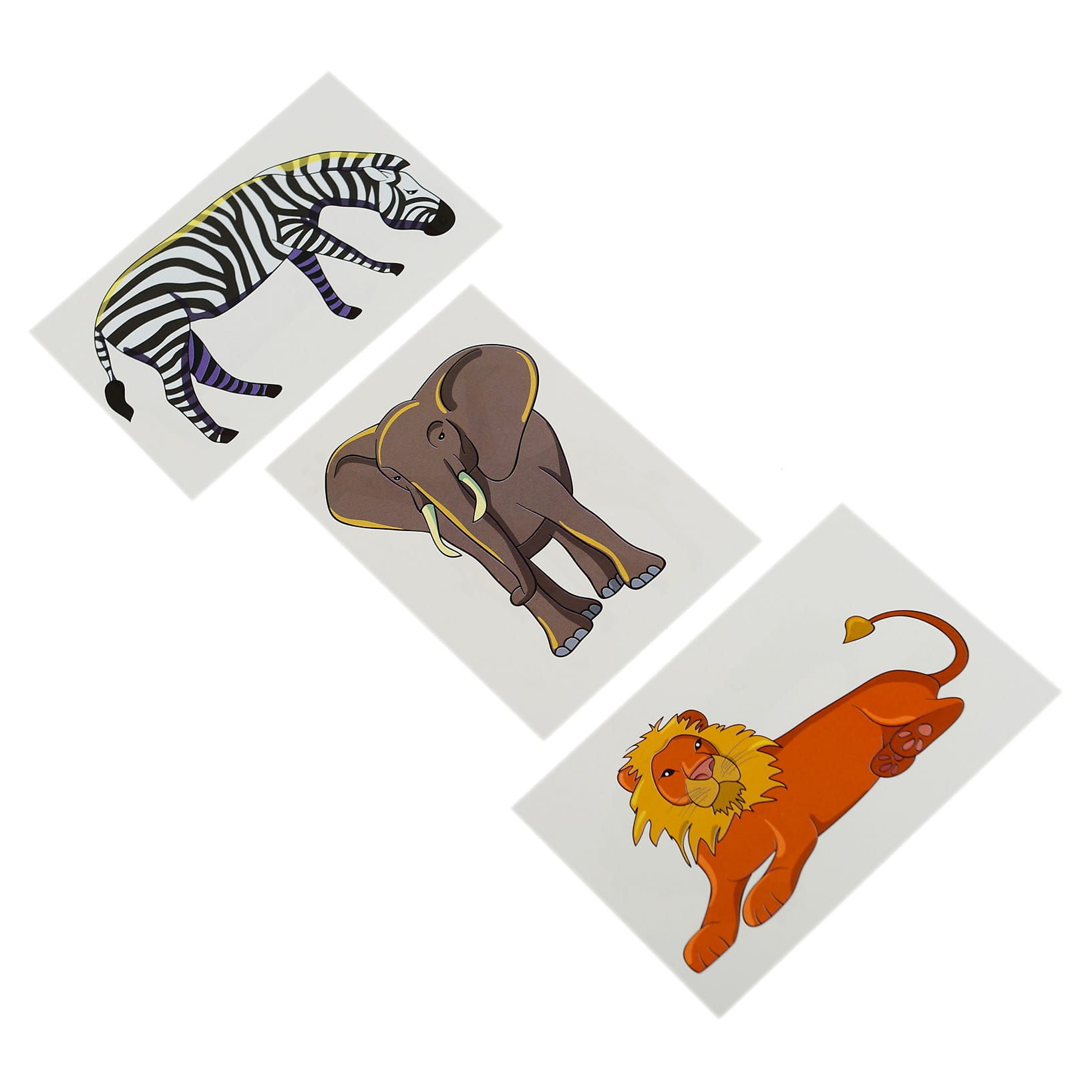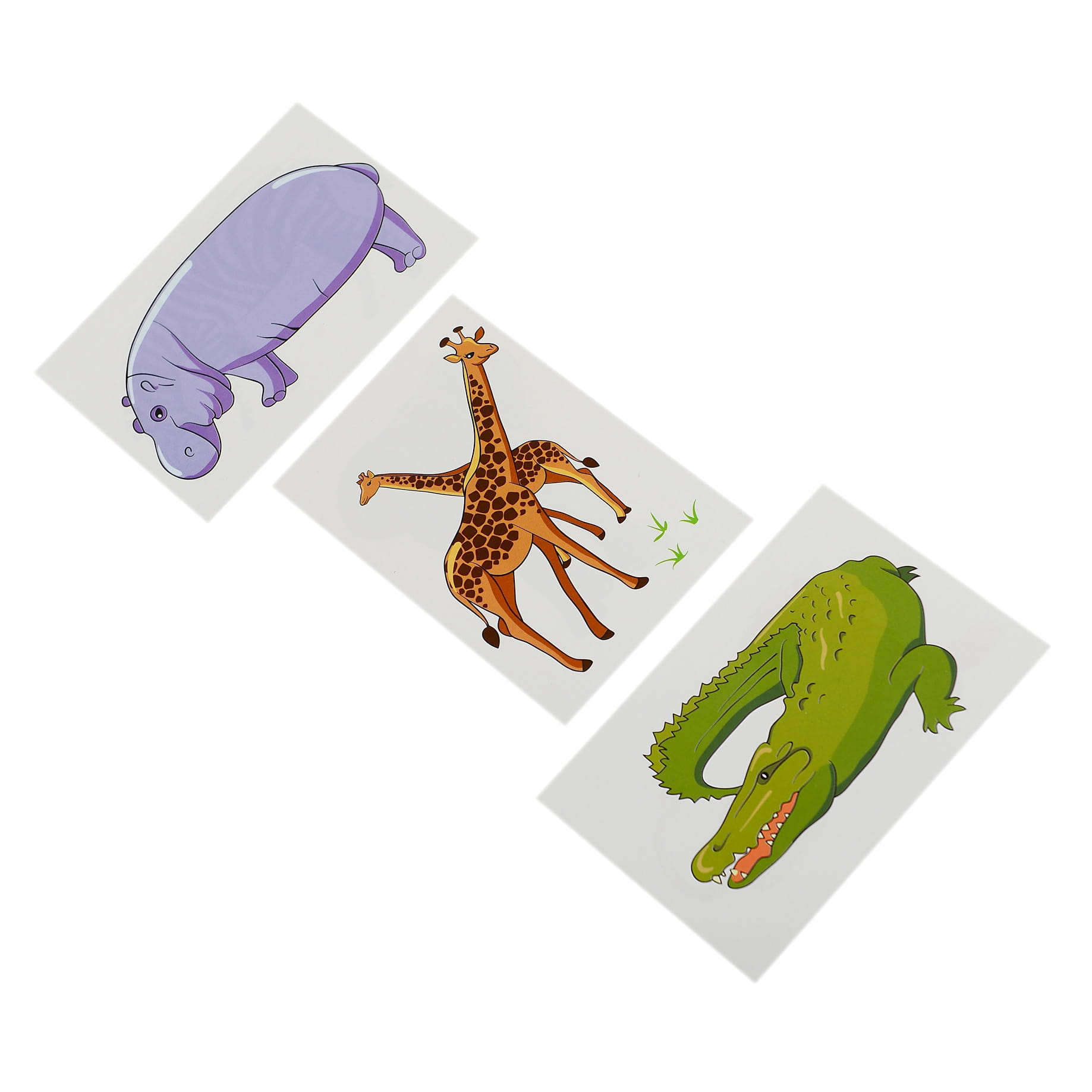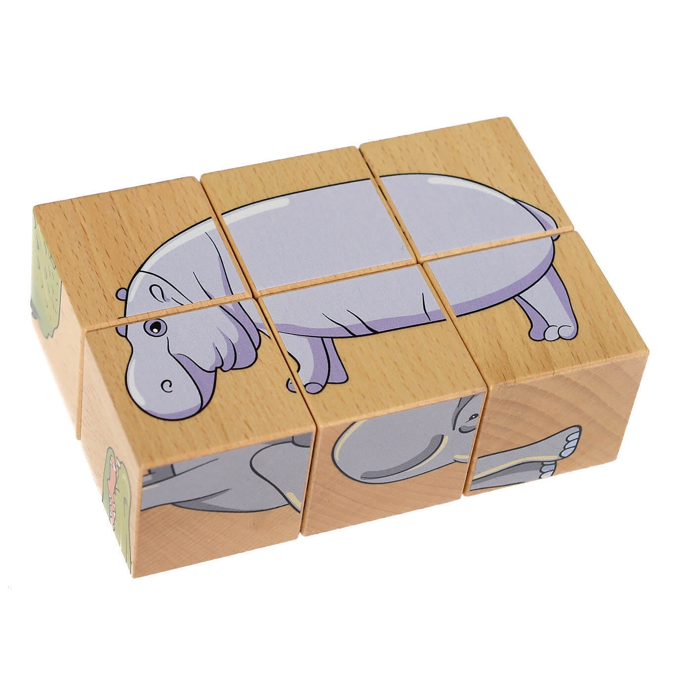W zestawie 6 klocków w kształcie sześcianów. Na każdej stronie znajduje się element innego obrazka przedstawiającego zwierzę z Safari, m.in. lwa, małpkę, słonia, krokodyla, hipopotama.